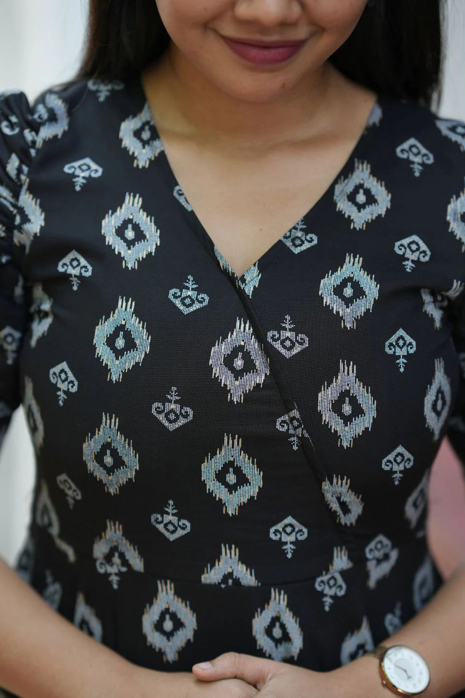 Step out in style with this black and grey ethnic print dress designed to flatter all body types. The V neck and elbow-length puffed sleeves create a charming look, while the fitted waist enhances your silhouette. Its flared hem and full-length lining add comfort and ease to your movements, making it perfect for both casual outings and special occasions. Made from soft viscose, this A-line dress is as comfortable as it is stylish.