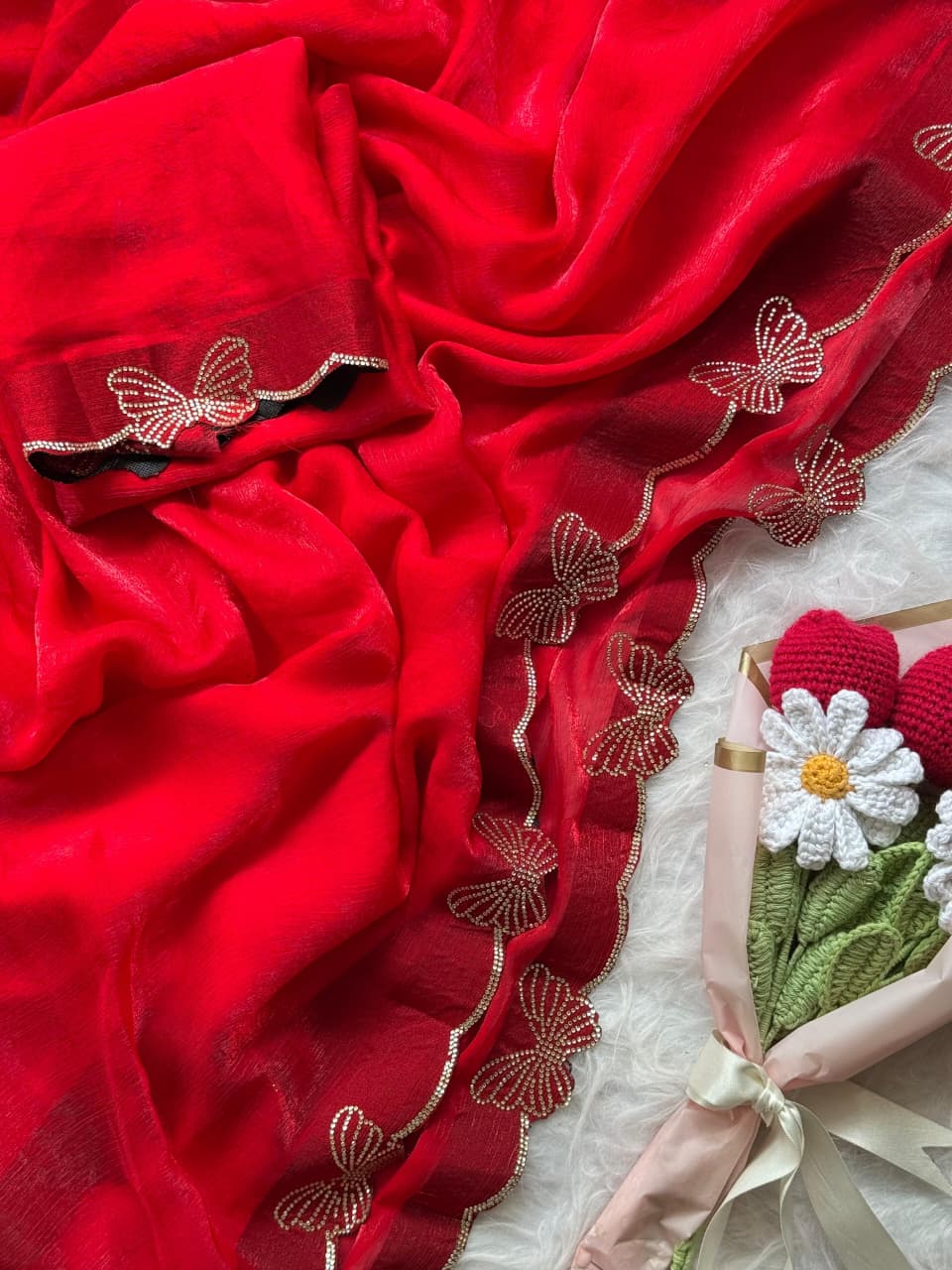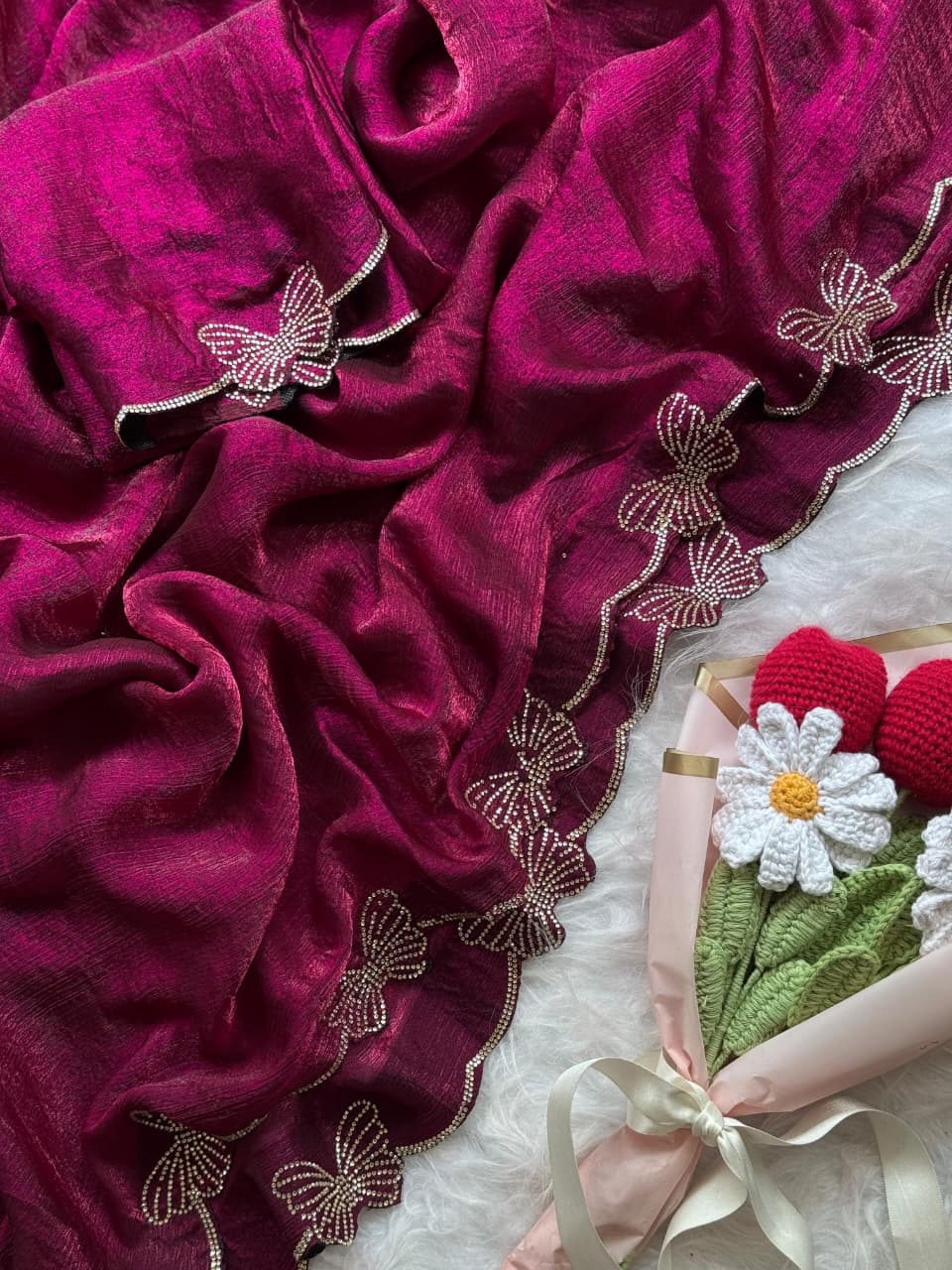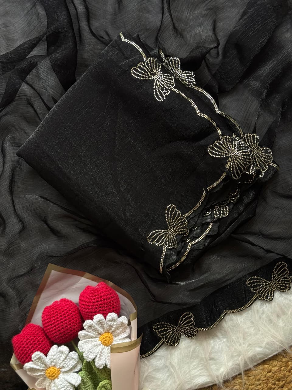 Discover elegance with our Butterfly Jarkan Saree featuring stone C-pallu border, paired with a Chinon silk blouse. Premium quality & timeless charm.