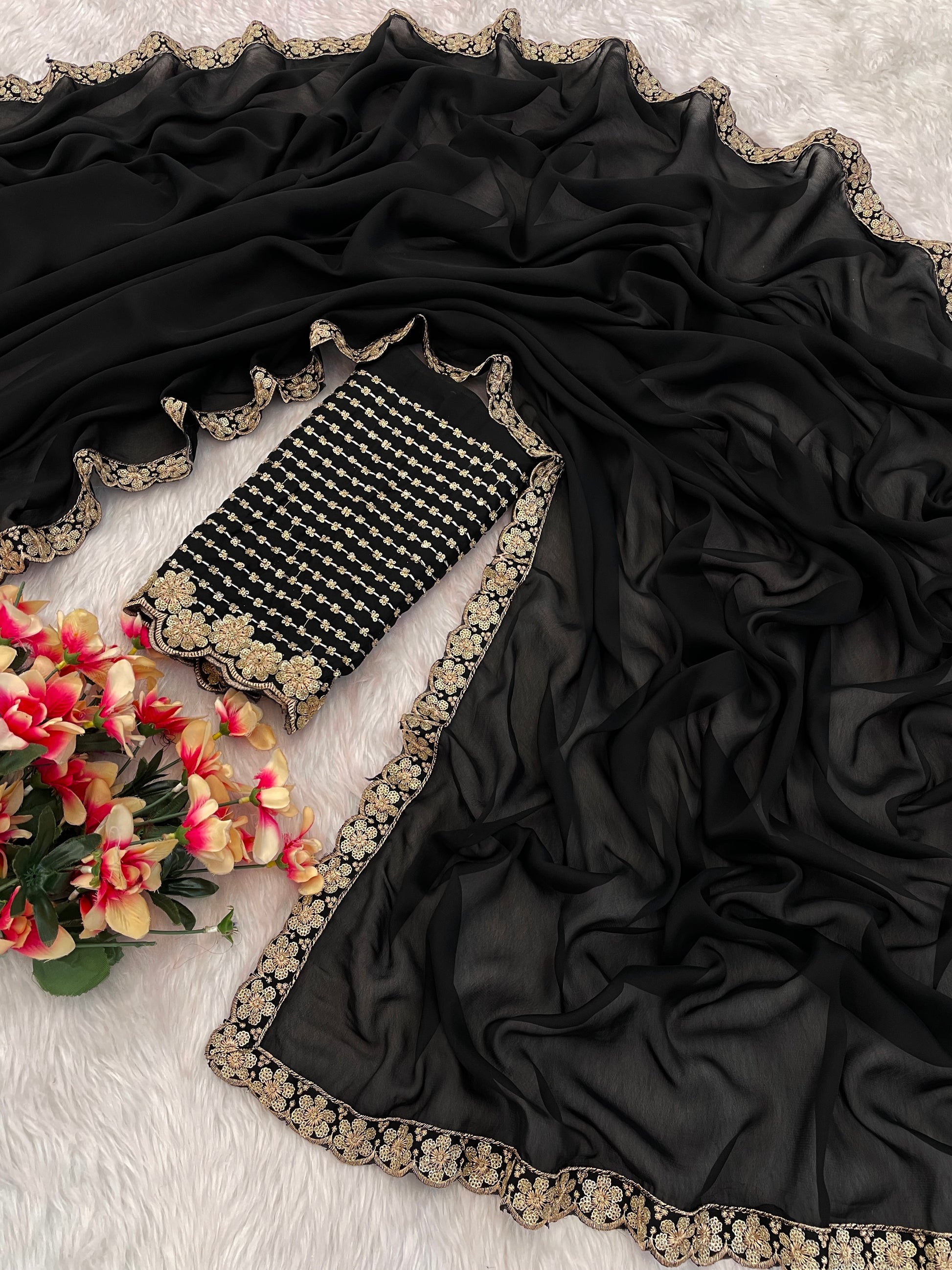 - Contrast Blouse: Featuring intricate embroidery, seamlessly complementing the saree’s grandeur.