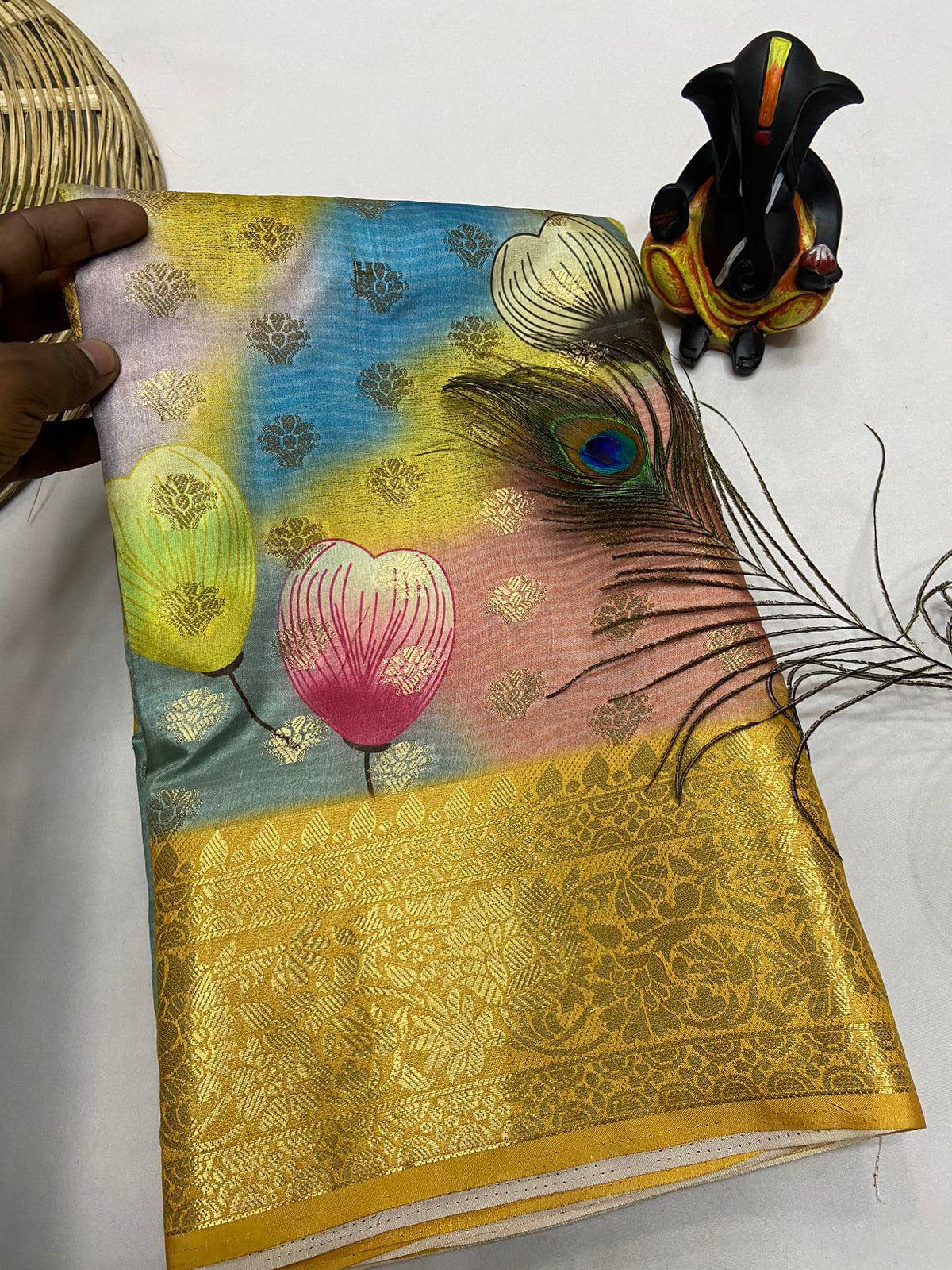Allover saree heavy banarasi multi weaving highlighted with digital print with rich woven border and pallu.