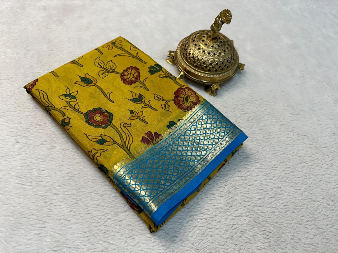 Expertly made with high-quality 120gsm Pure Printed Mysore silk, our elegant sarees feature beautiful prints all over and a bold bentex border. With the added benefit of being washable, these sarees are perfect for everyday wear. Please wash separately to prevent any color bleeding. For best results, do not iron and opt for a Calendar finishing after multiple uses. Please note that minor print variations are common and not considered as damages.