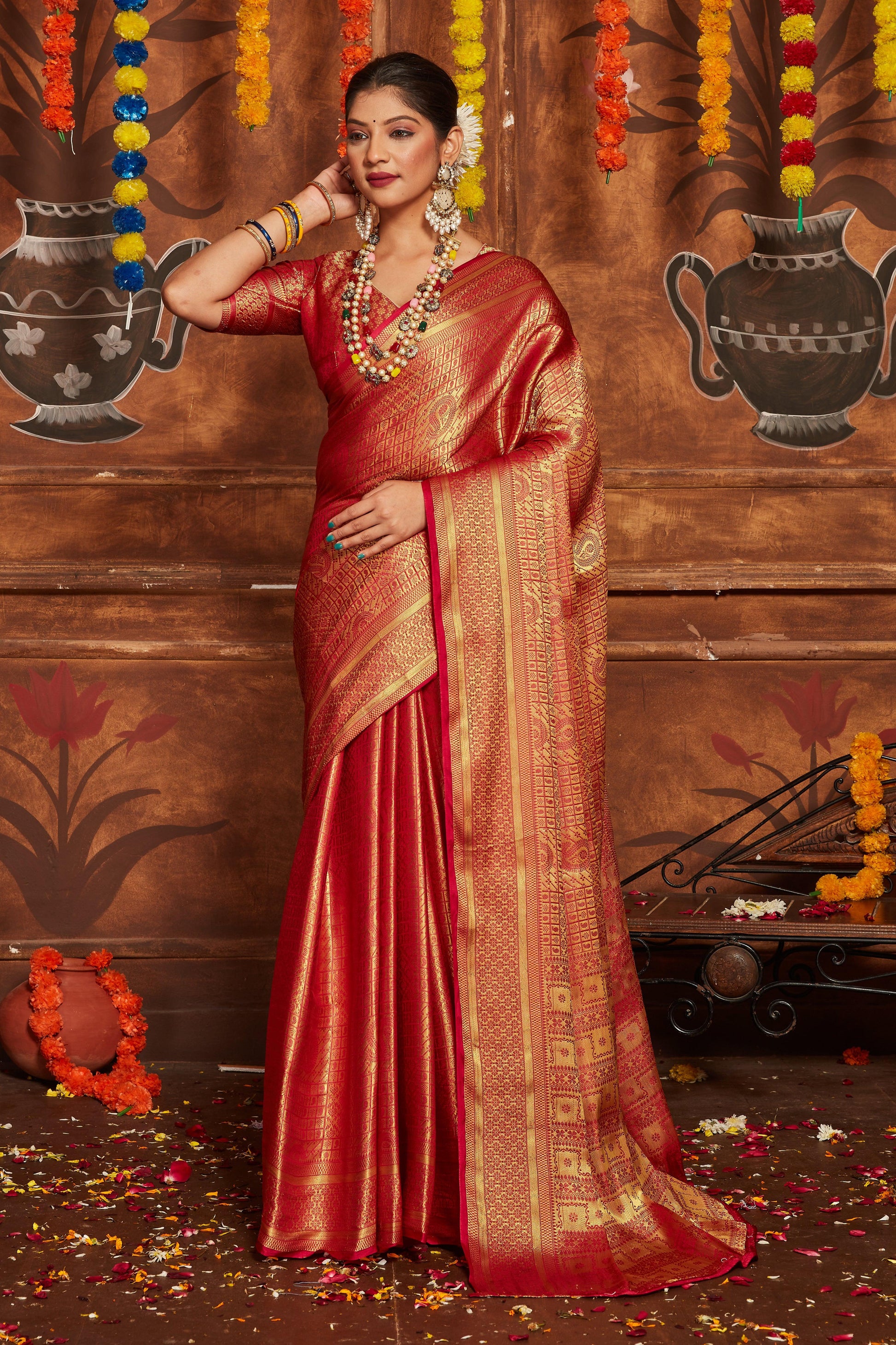 Elevate your style with Elegance Redefined. Crafted from the finest soft silks, this luxurious fabric is expertly woven with full zari detailing. Choose from a selection of elegant designs and solid colors to add a touch of sophistication to any outfit. Perfect for those who appreciate high quality and refined craftsmanship.