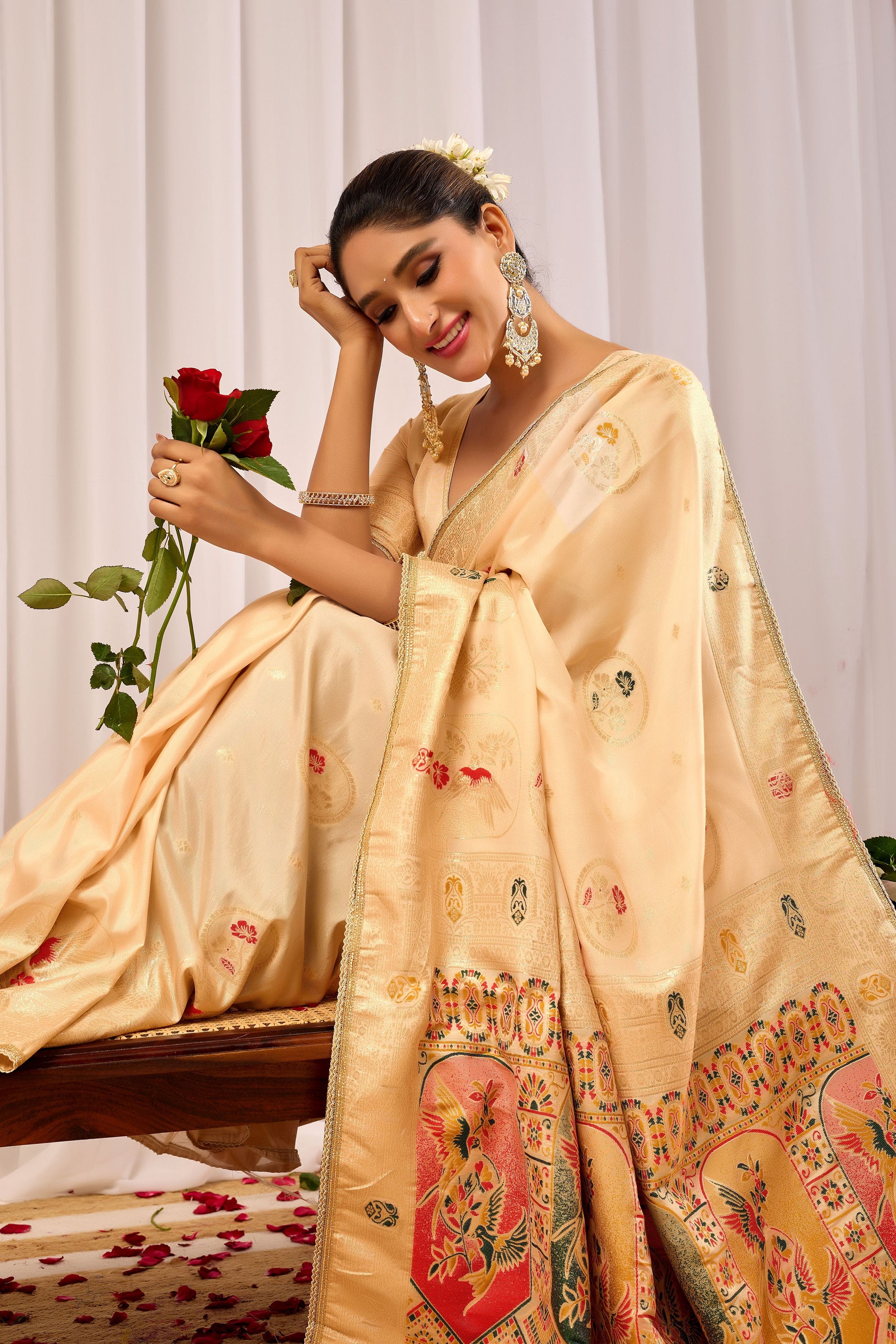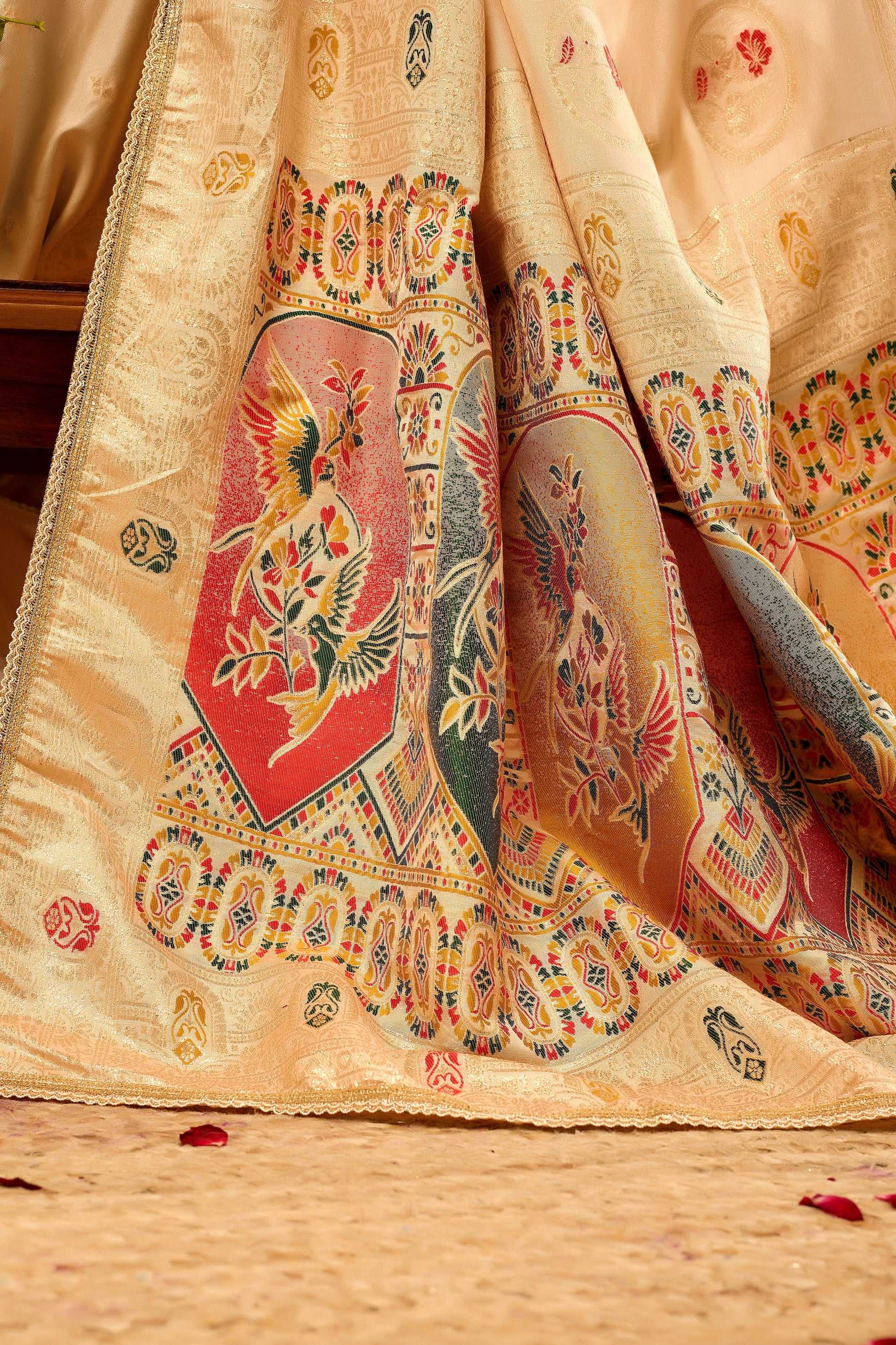 This exquisite Champagne Gold Satin silk saree is a perfect blend of tradition and sophistication. Crafted with fine handwoven silk, it features delicate woven motifs spread gracefully across the body, adding subtle texture and charm. The saree is beautifully enhanced with a richly detailed pallu showcasing traditional artistic patterns and vibrant accents, lending it a regal appeal. Finished with a refined border, this saree drapes effortlessly and offers a luxurious sheen. Ideal for weddings, festive celebrations, and special occasions, it pairs elegantly with statement jewelry for a truly timeless ethnic look.