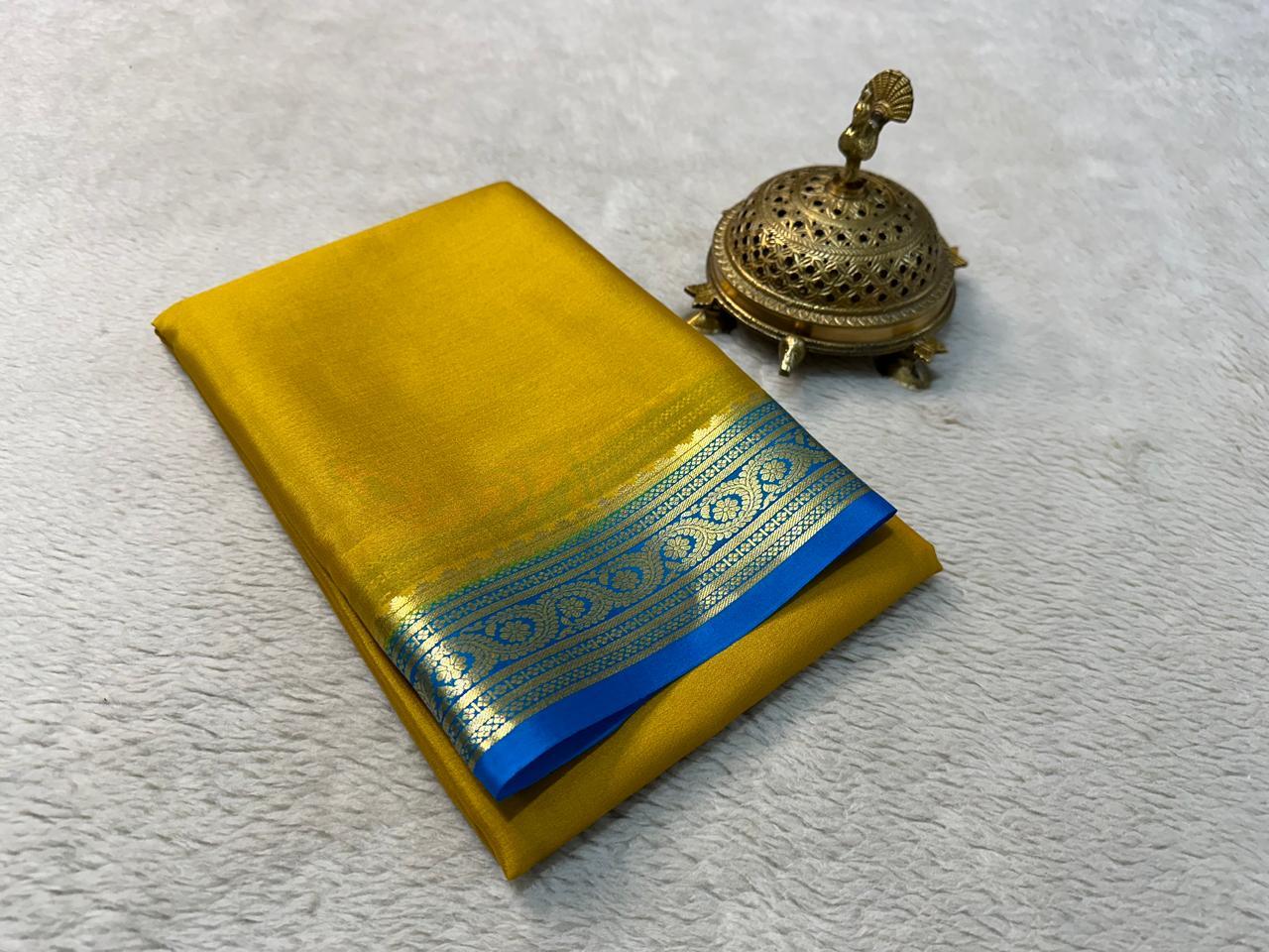 Indulge in the luxurious beauty of Pure Mysore silk sarees. Adorned with a Traditional border and beautiful contrast colour combination, these sarees will bring elegance and grace to your wardrobe. Embrace the passionate and inspiring appeal of these sarees today!