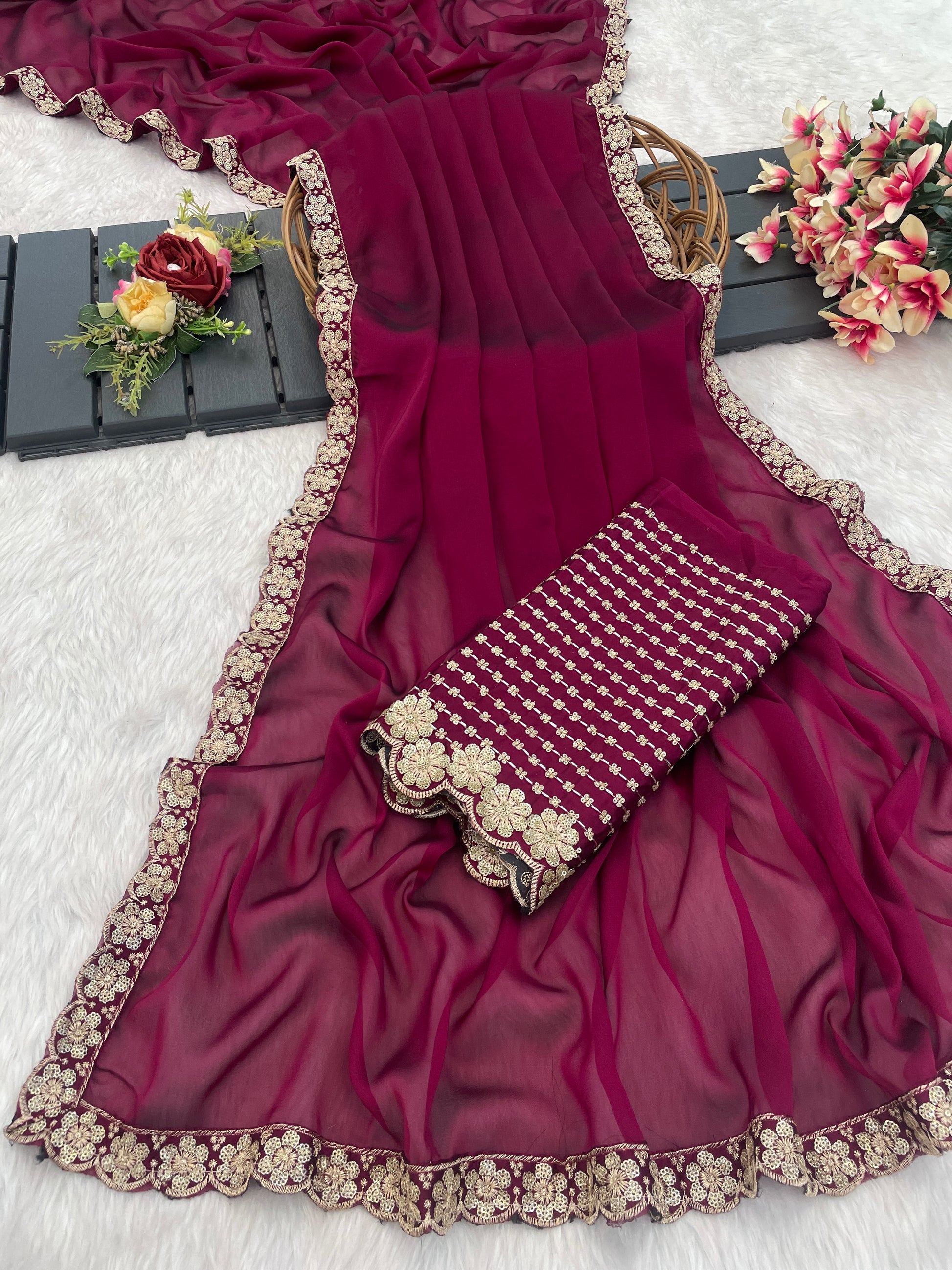 - Contrast Blouse: Featuring intricate embroidery, seamlessly complementing the saree’s grandeur.