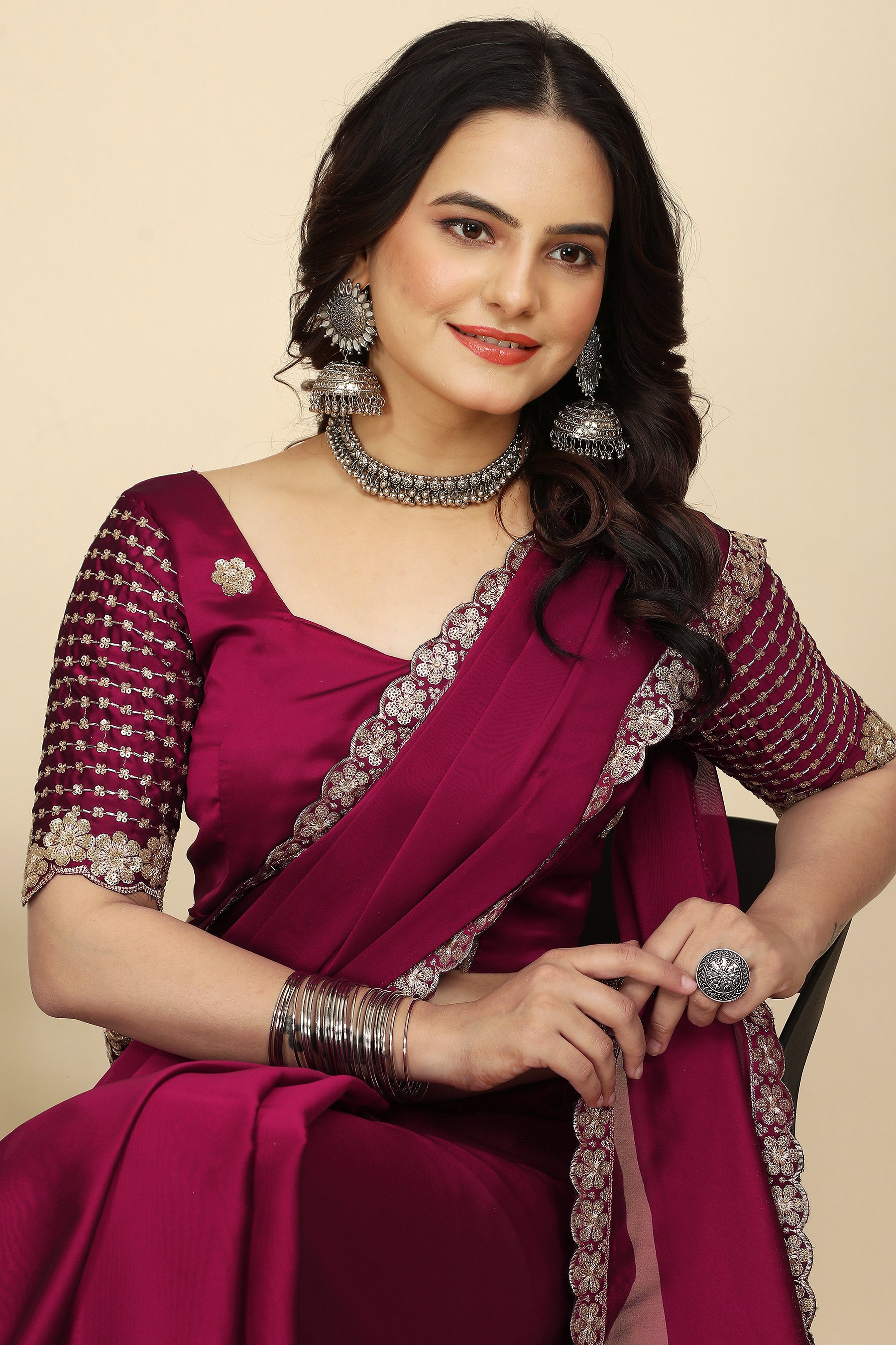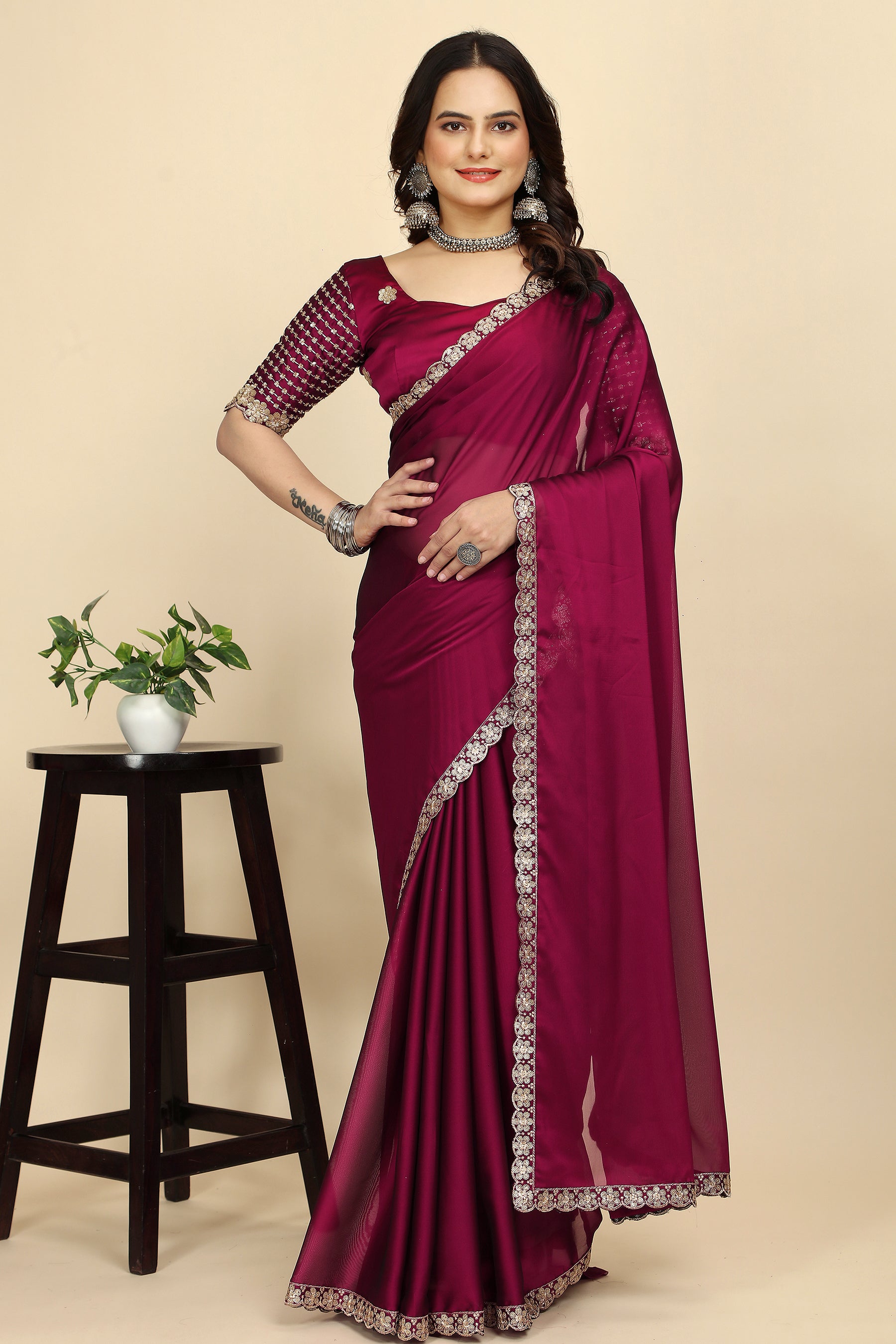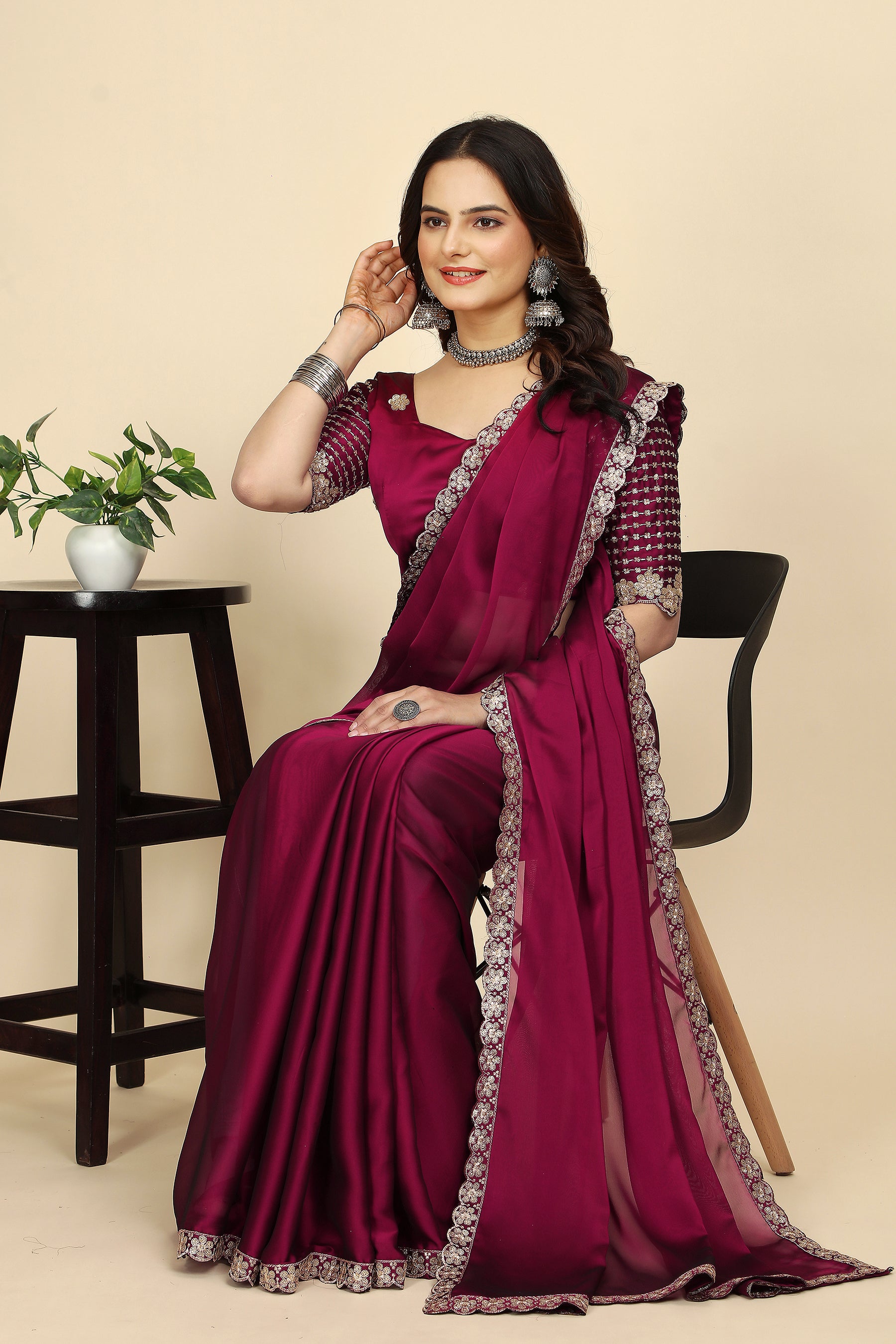 Step into elegance with our premium Space Silk Saree, crafted to exude sophistication and charm. Designed for the modern yet timeless aesthetic, this masterpiece showcases intricate C-Pallu embroidery adorned with beautiful moti handwork, adding a regal touch to your ensemble.