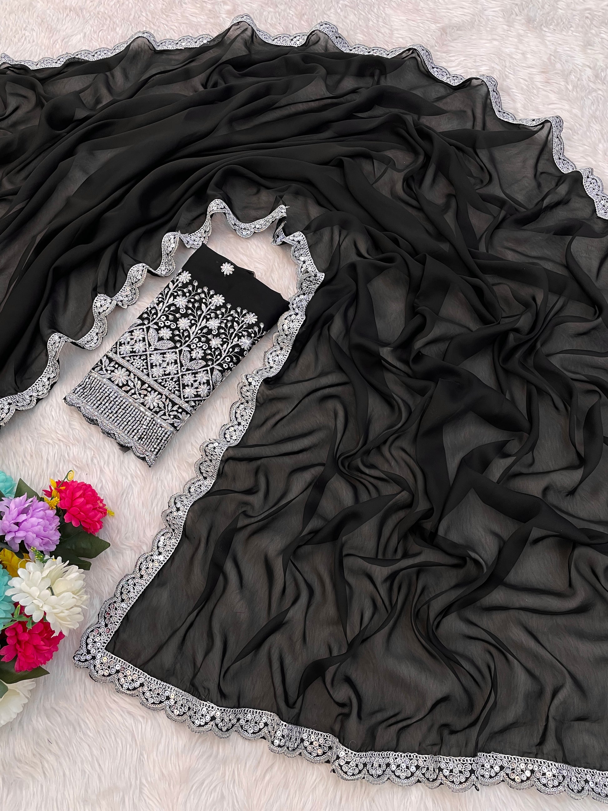 - Contrast Blouse: Featuring intricate embroidery, seamlessly complementing the saree’s grandeur.