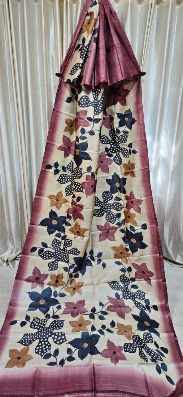 Pure Bishnupuri Tussar Silk Saree with Special Hand-Painted Design and Blouse Piece in Wine