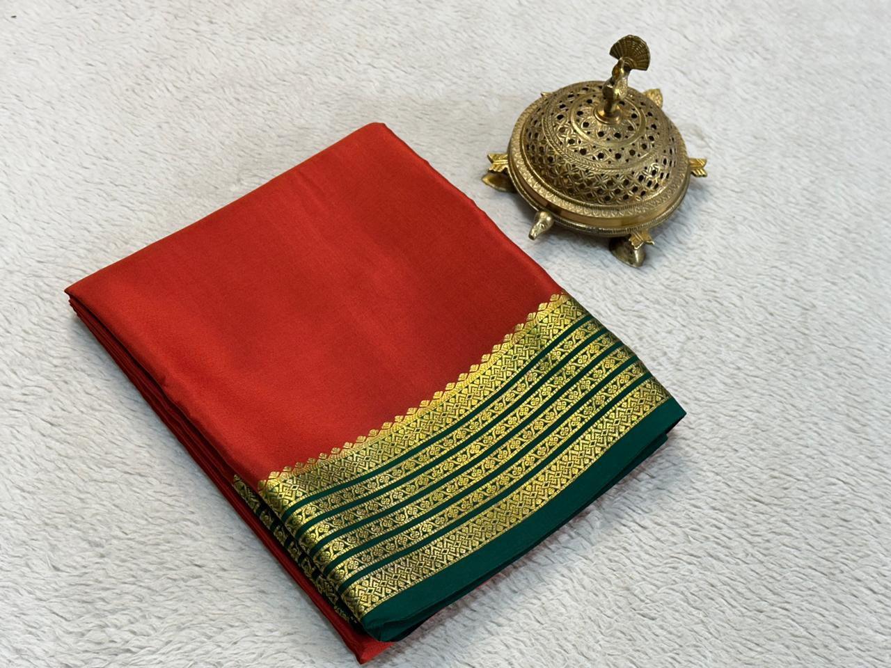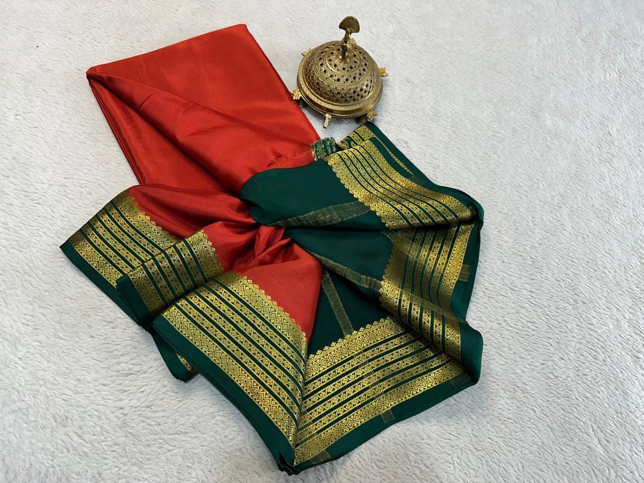 Indulge in the luxurious beauty of Pure Mysore silk sarees. Adorned with a Traditional border and beautiful contrast colour combination, these sarees will bring elegance and grace to your wardrobe. Embrace the passionate and inspiring appeal of these sarees today!