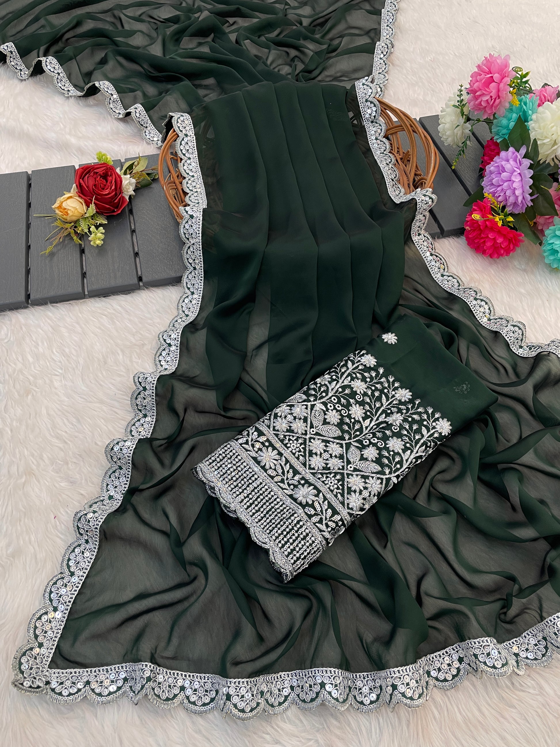 - Contrast Blouse: Featuring intricate embroidery, seamlessly complementing the saree’s grandeur.