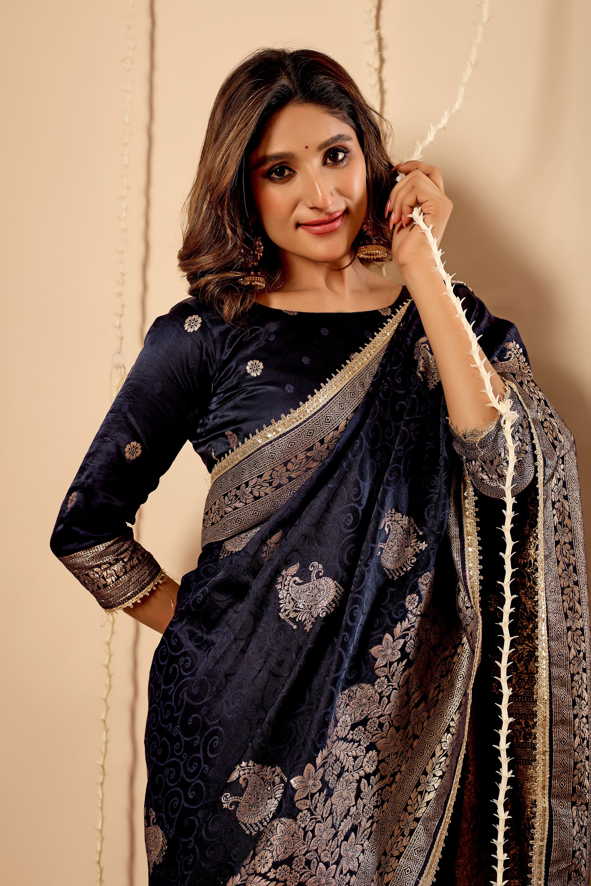 Midnight Navy Blue Satin Silk Saree with Antique Silver Zari Work