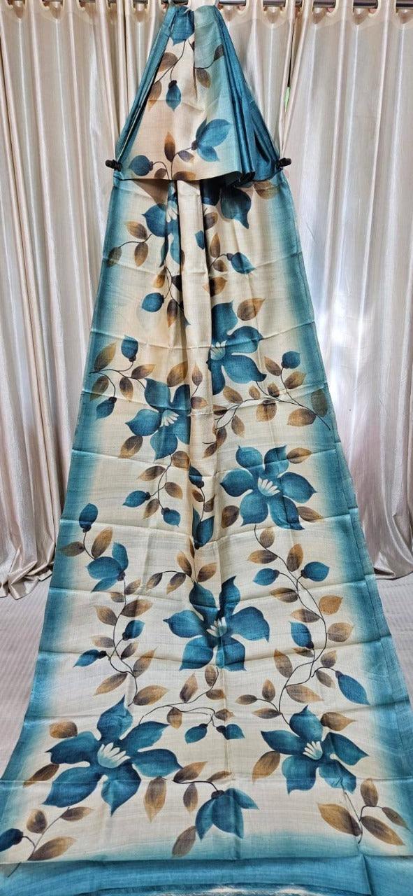 Pure Bishnupuri Tussar Silk Saree with Special Hand-Painted Design and Blouse Piece in Rama