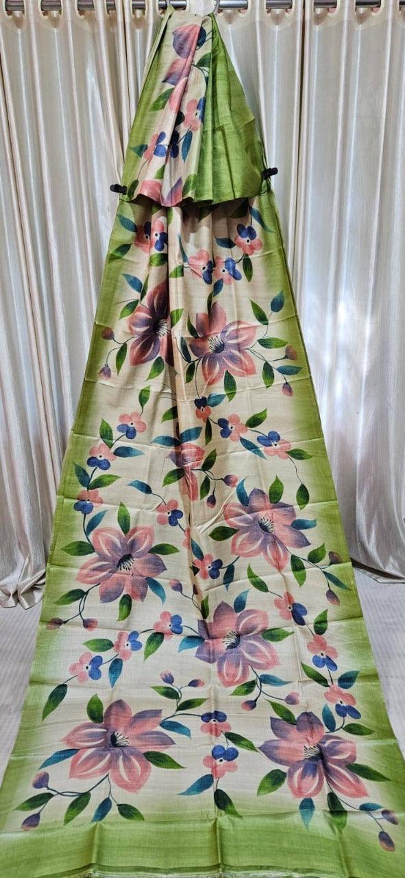 Pure Bishnupuri Tussar Silk Saree with Special Hand-Painted Design and Blouse Piece in Light Green