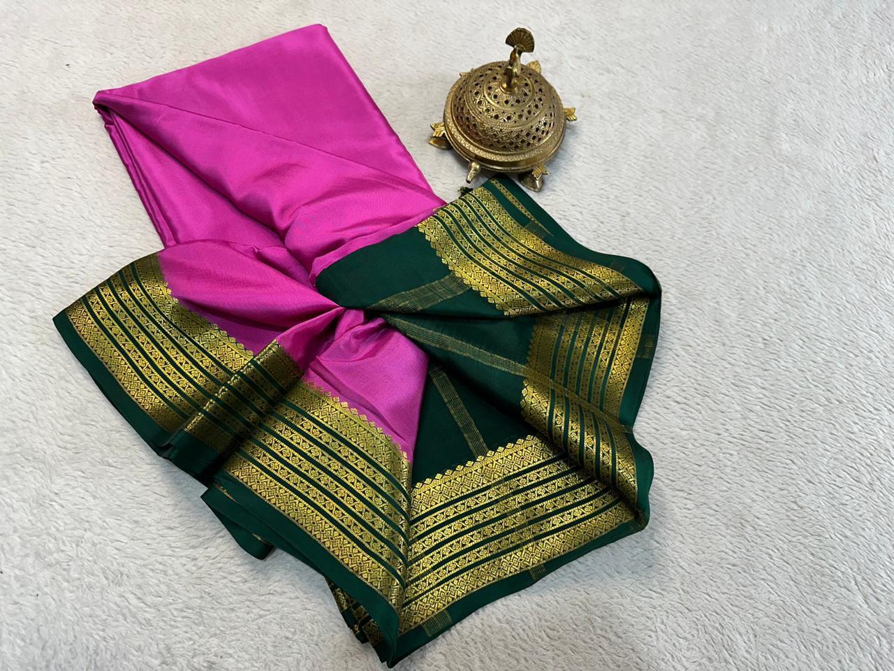Indulge in the luxurious beauty of Pure Mysore silk sarees. Adorned with a Traditional border and beautiful contrast colour combination, these sarees will bring elegance and grace to your wardrobe. Embrace the passionate and inspiring appeal of these sarees today!