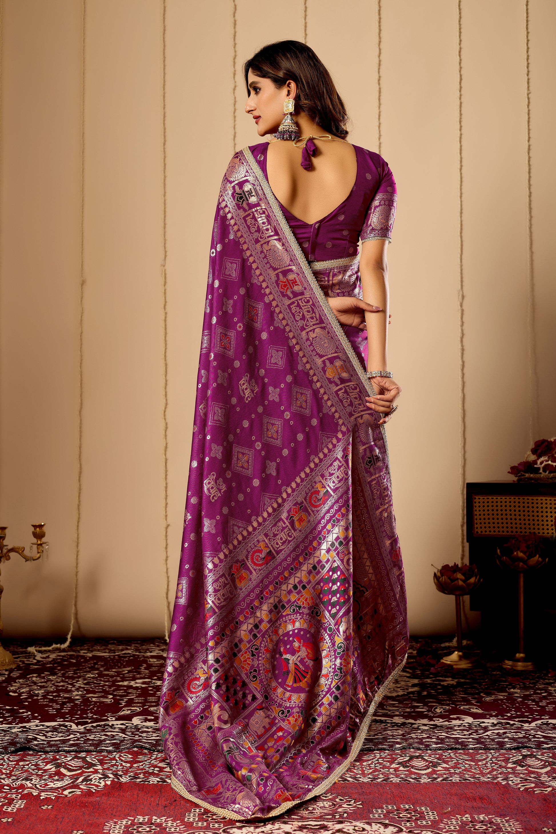 Royal Amethyst Heritage Satin Silk Saree with Intricate Zari Detailing