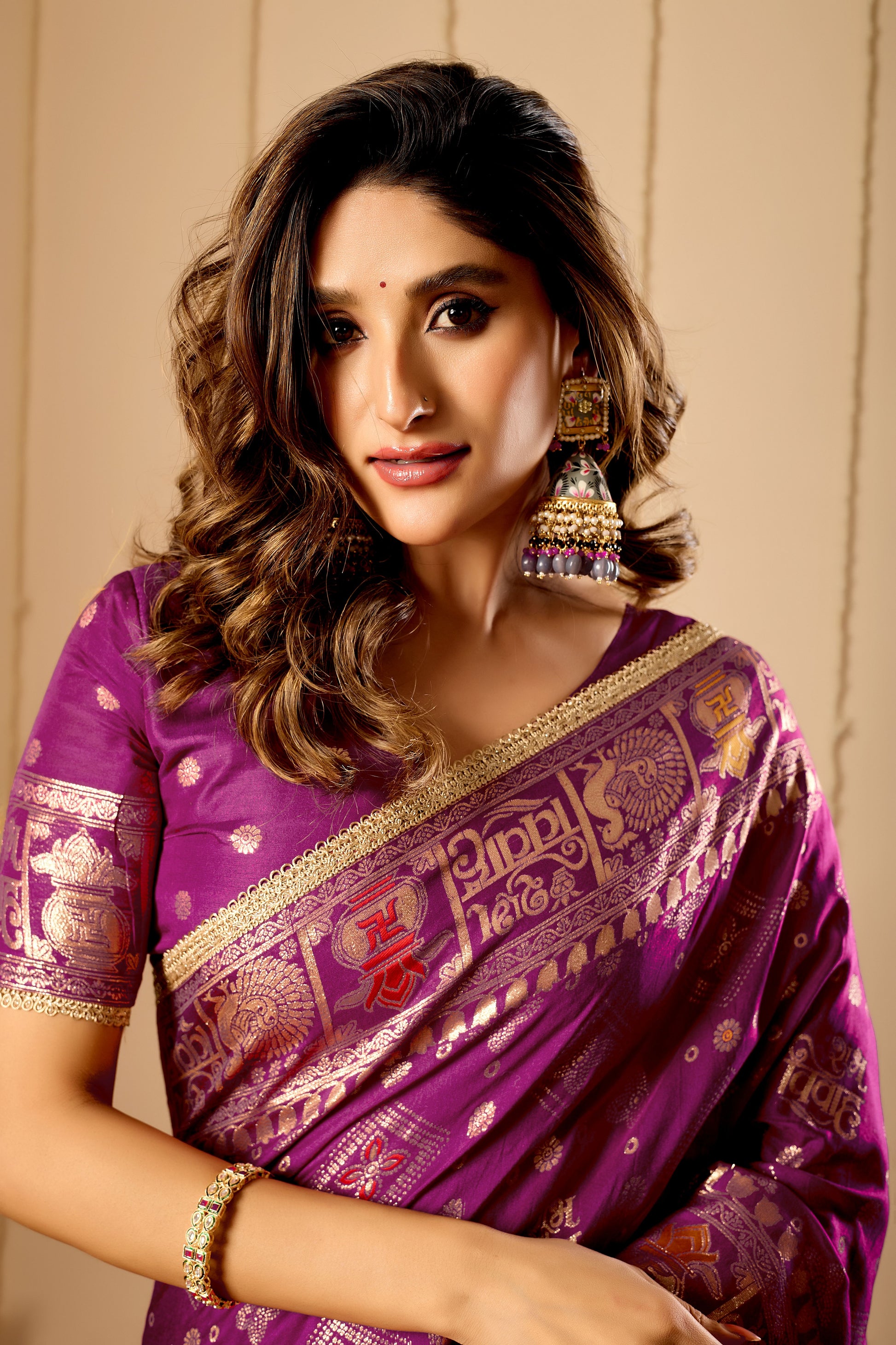 Embrace regal elegance with our Royal Amethyst Heritage Satin Silk Saree, a stunning expression of traditional craftsmanship and timeless beauty. Crafted from premium silk, this saree features a deep amethyst purple base adorned with intricate self-woven motifs that add richness and visual depth. The fabric’s soft sheen enhances its graceful drape, creating a refined and flattering silhouette.