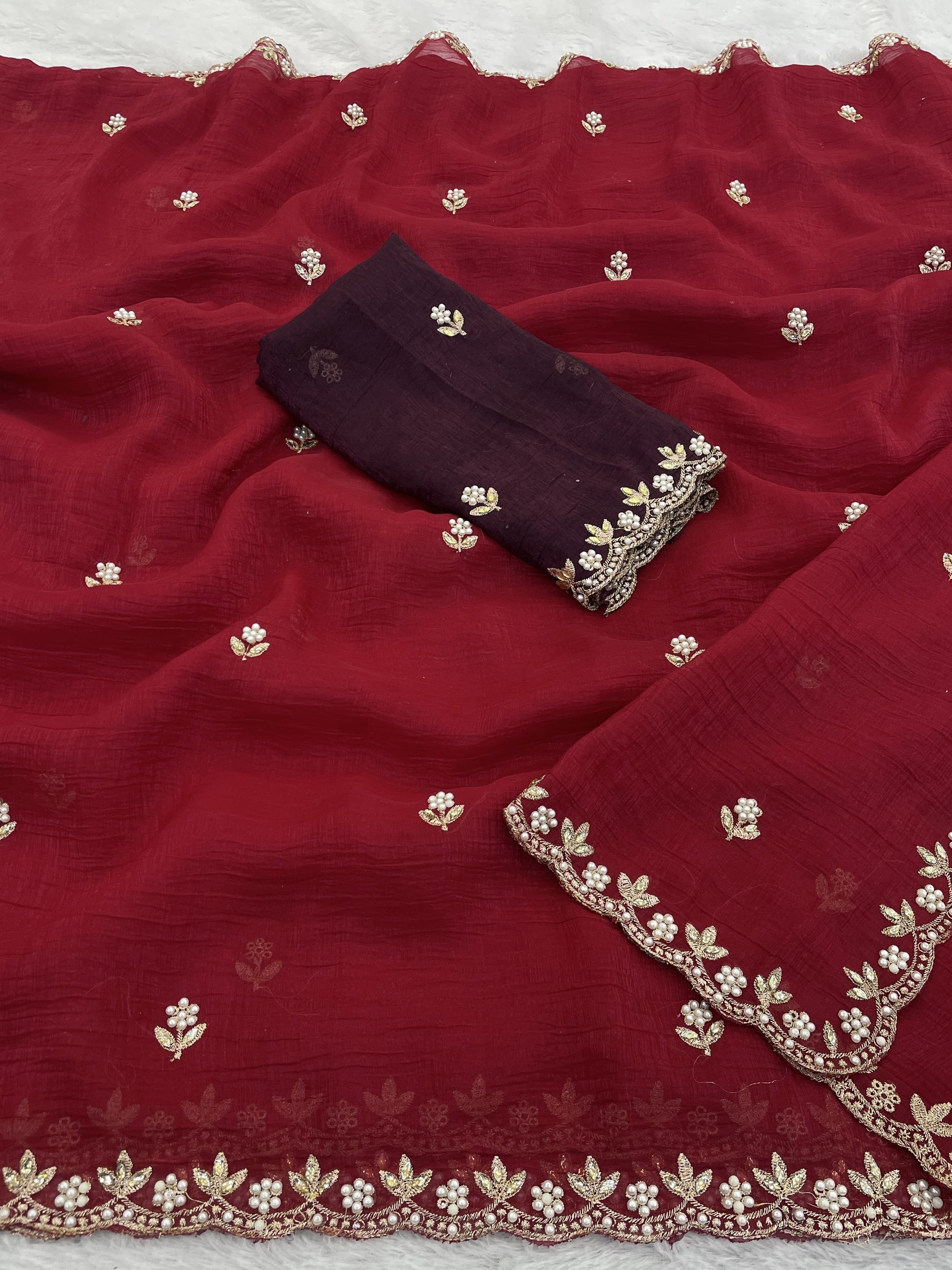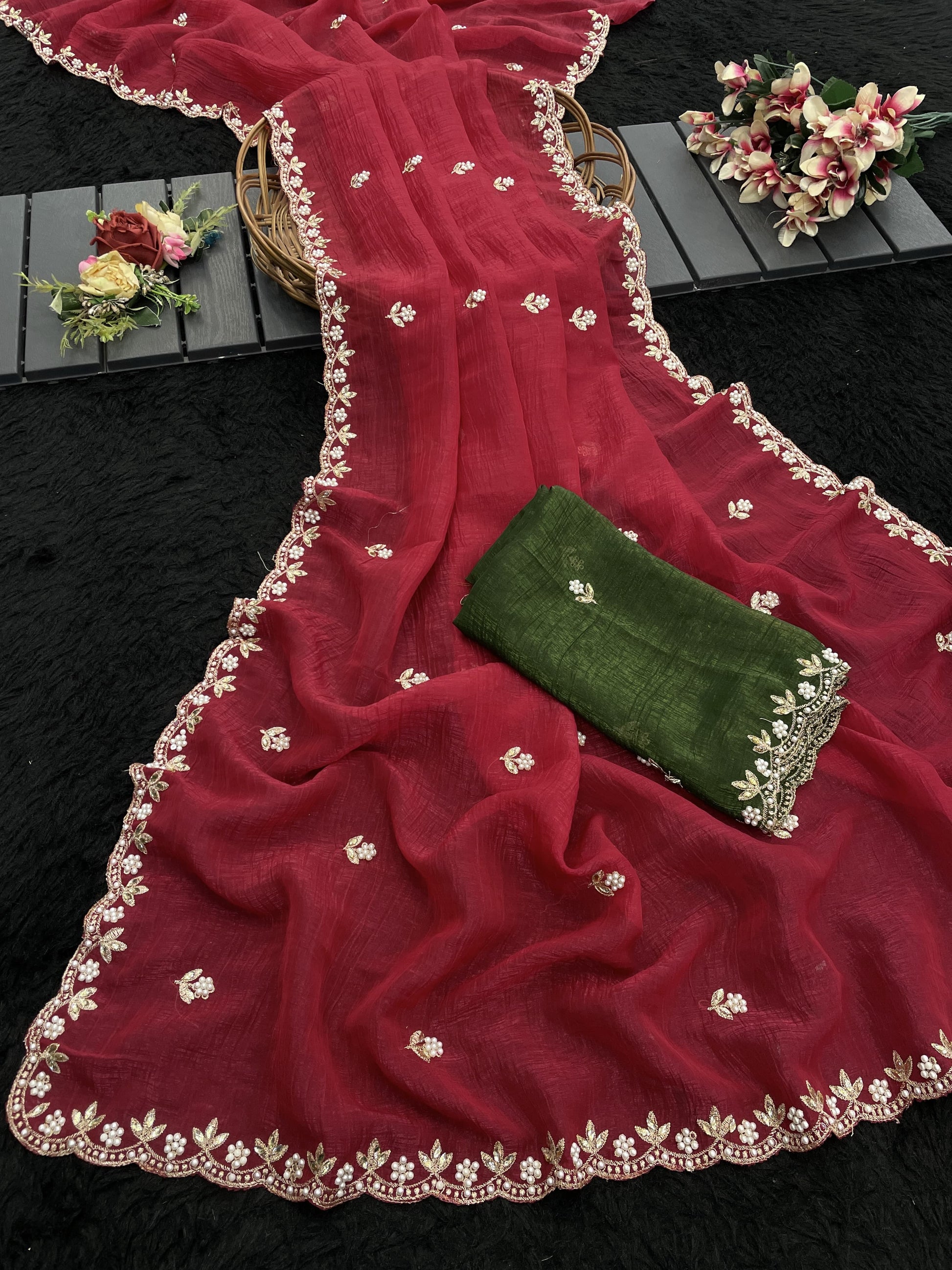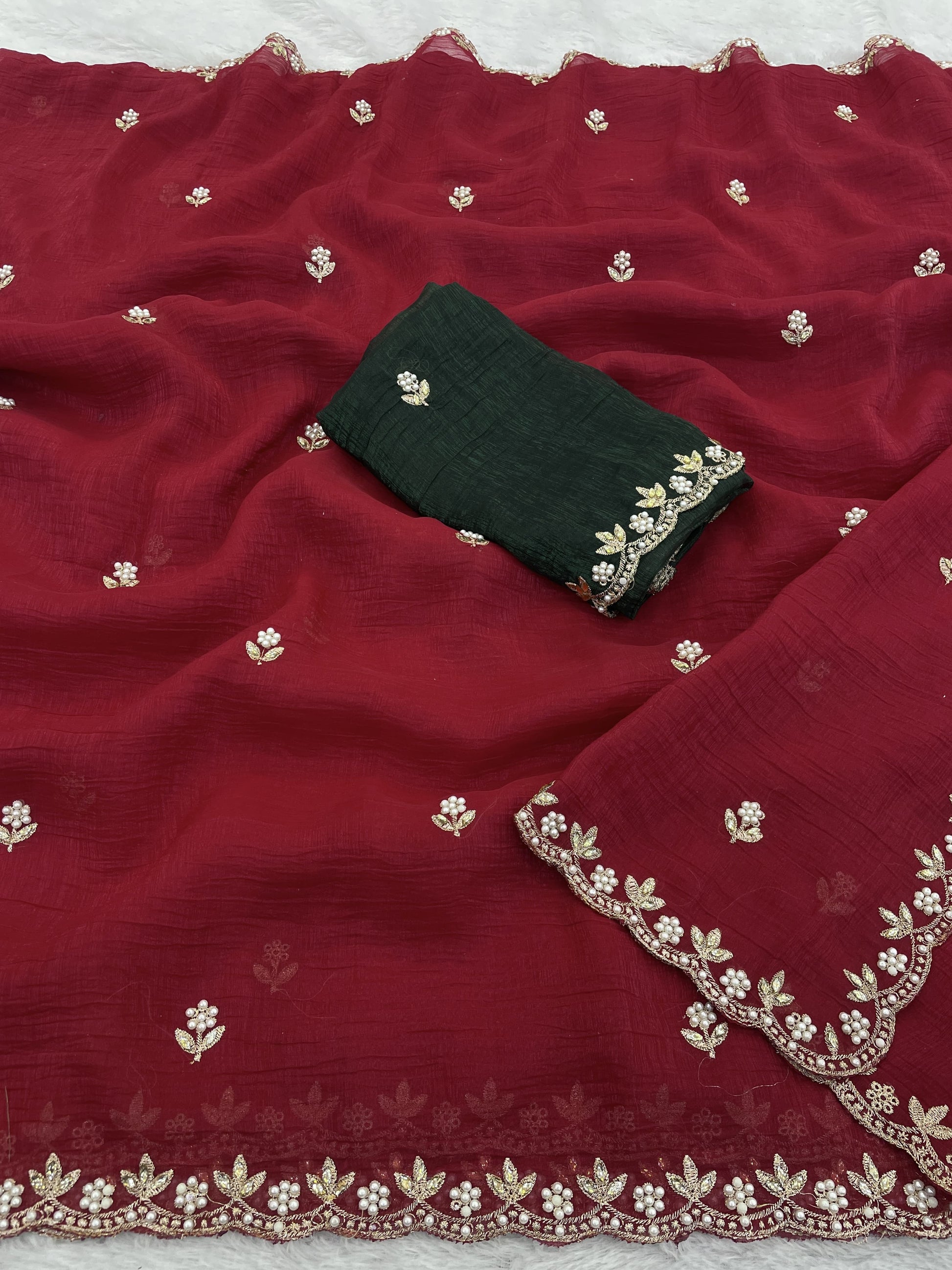Step into elegance with our premium Space Silk Saree, crafted to exude sophistication and charm. Designed for the modern yet timeless aesthetic, this masterpiece showcases intricate C-Pallu embroidery adorned with beautiful moti handwork, adding a regal touch to your ensemble.