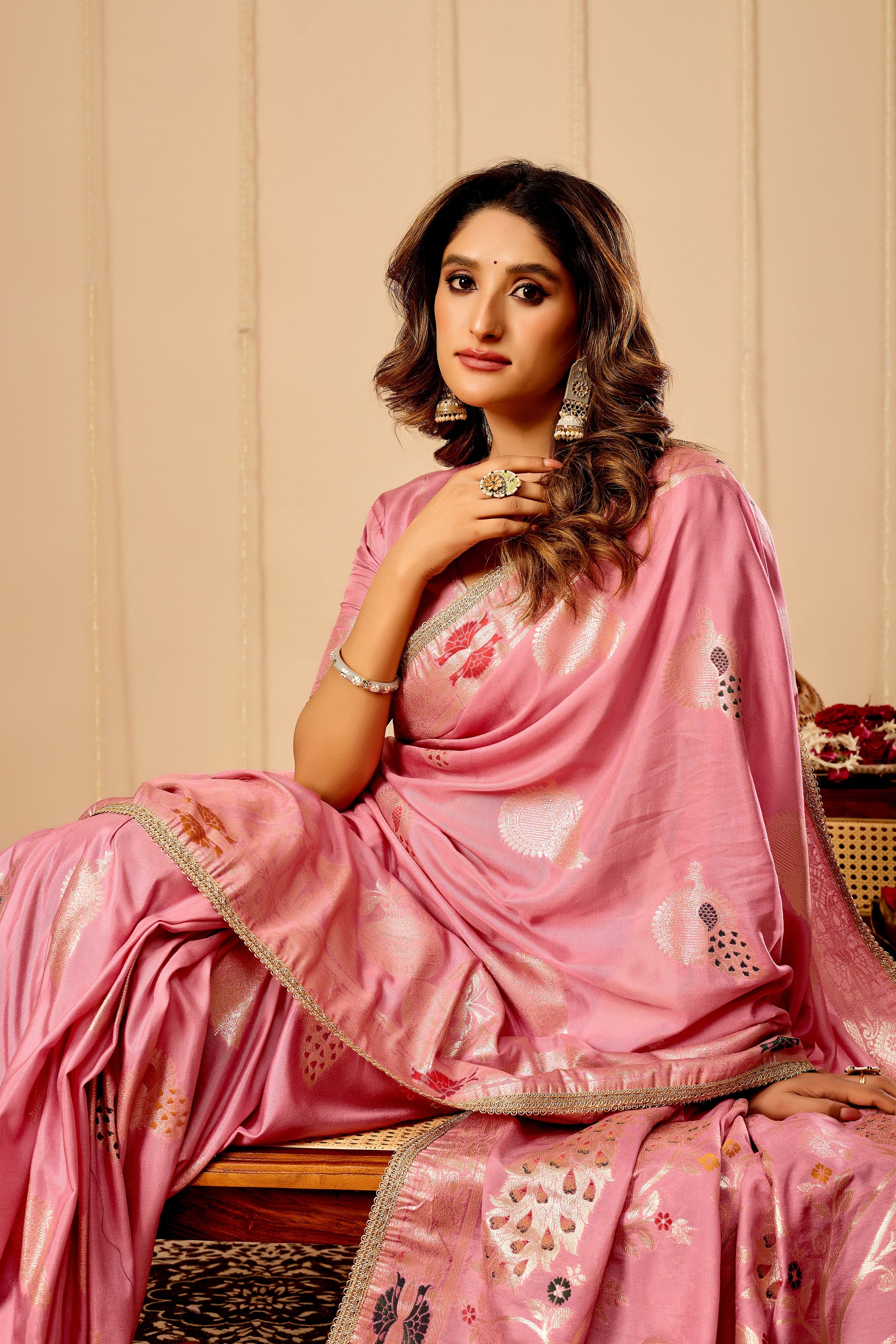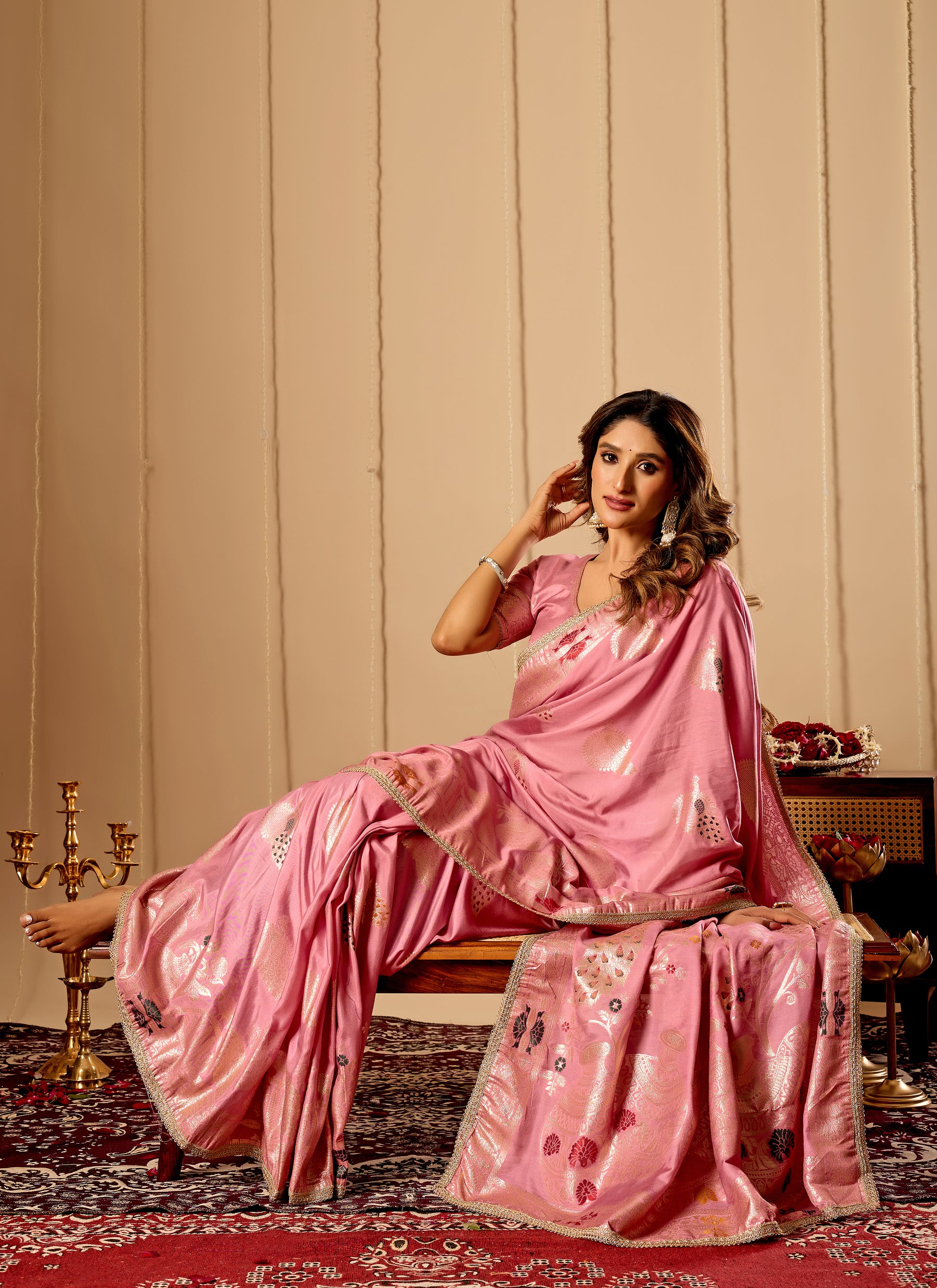 Soft Blush Pink Satin Silk Saree with Antique Gold Zari Motifs