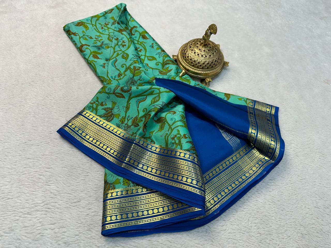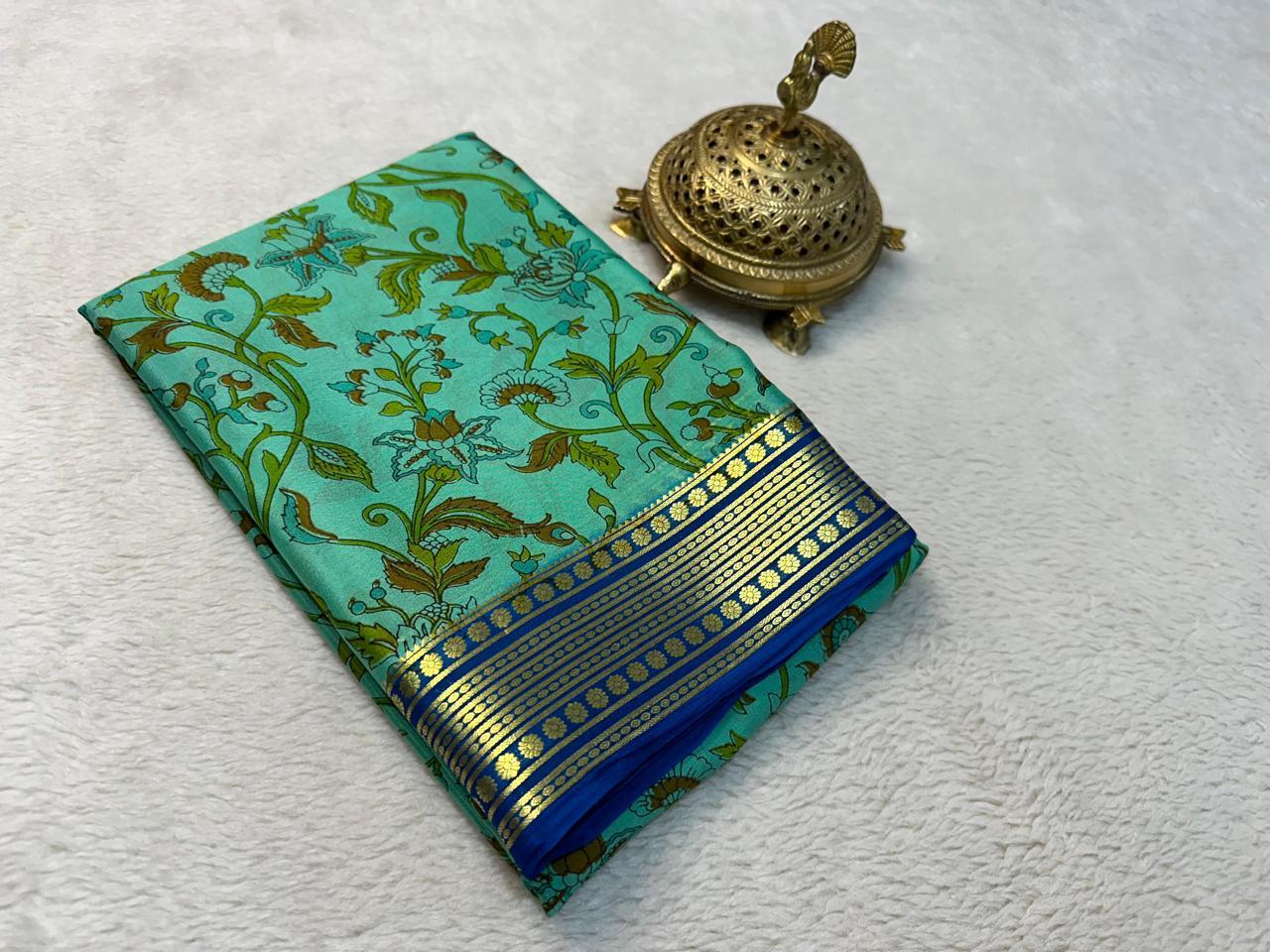 Expertly made with high-quality 120gsm Pure Printed Mysore silk, our elegant sarees feature beautiful prints all over and a bold bentex border. With the added benefit of being washable, these sarees are perfect for everyday wear. Please wash separately to prevent any color bleeding. For best results, do not iron and opt for a Calendar finishing after multiple uses. Please note that minor print variations are common and not considered as damages.