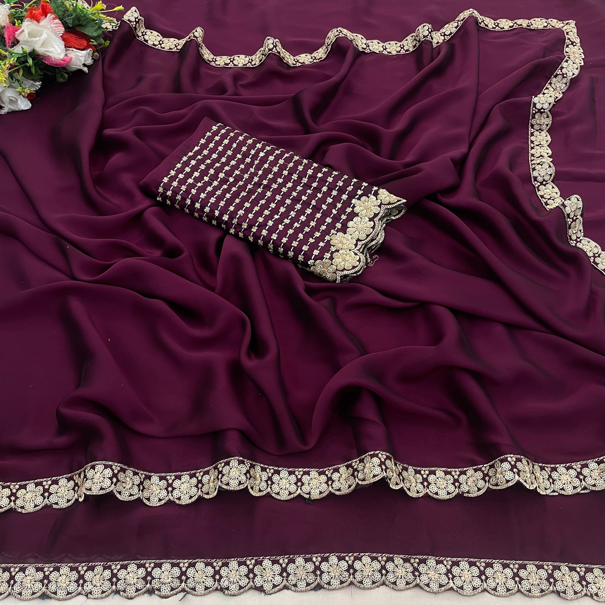 Step into elegance with our premium Space Silk Saree, crafted to exude sophistication and charm. Designed for the modern yet timeless aesthetic, this masterpiece showcases intricate C-Pallu embroidery adorned with beautiful moti handwork, adding a regal touch to your ensemble.