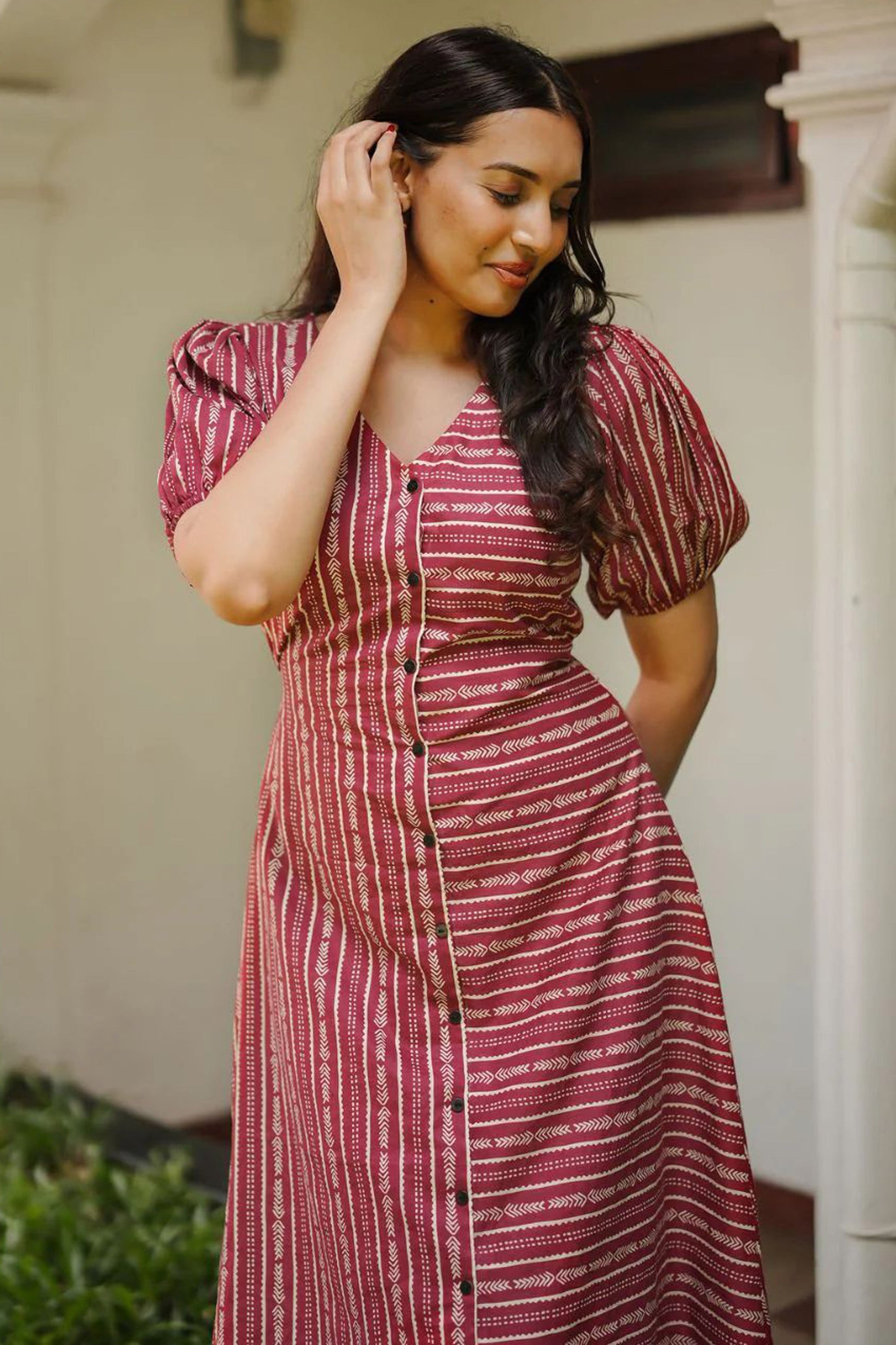 Women'S Maroon Featuring V Neck And Puffed Sleeves Aline Dress