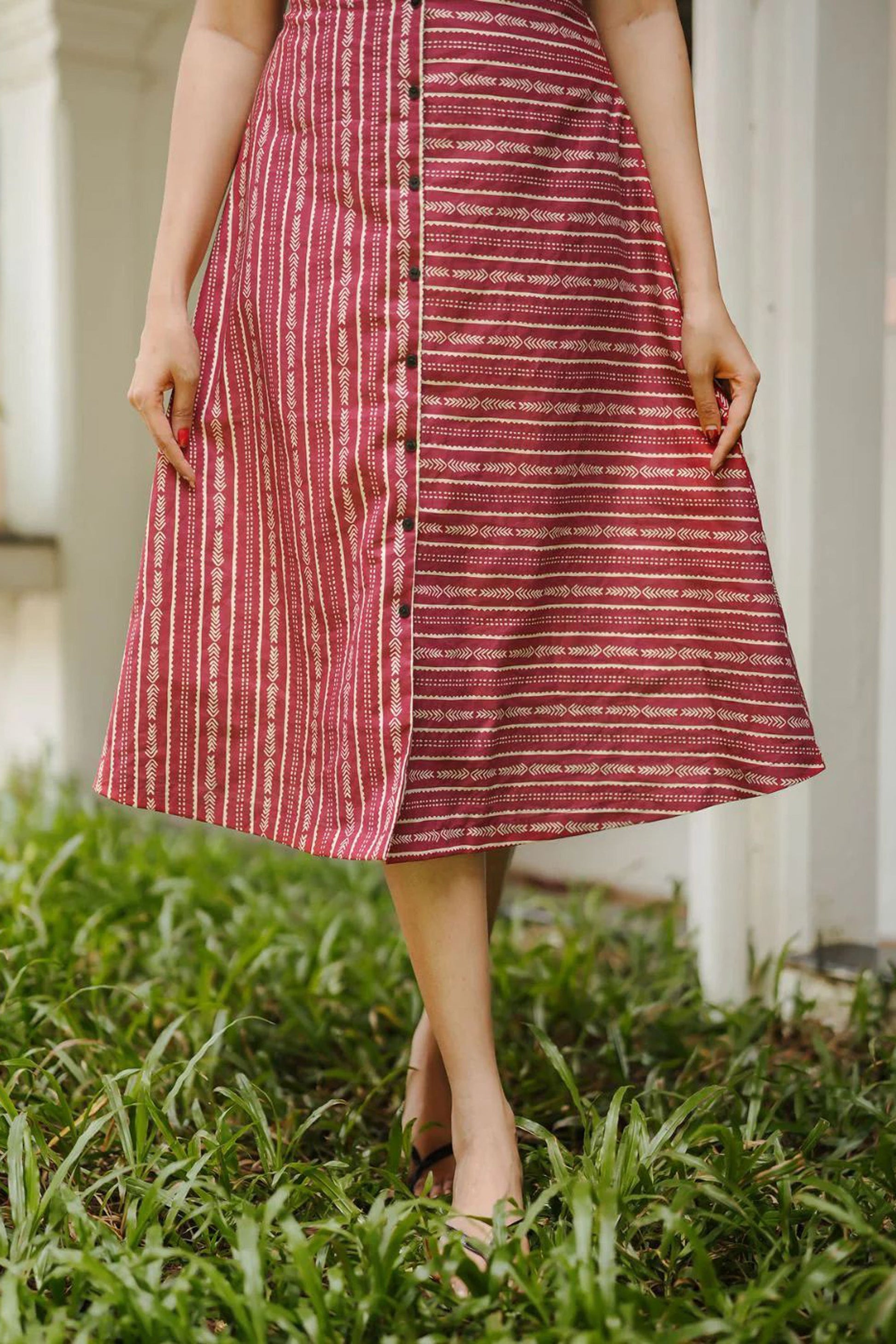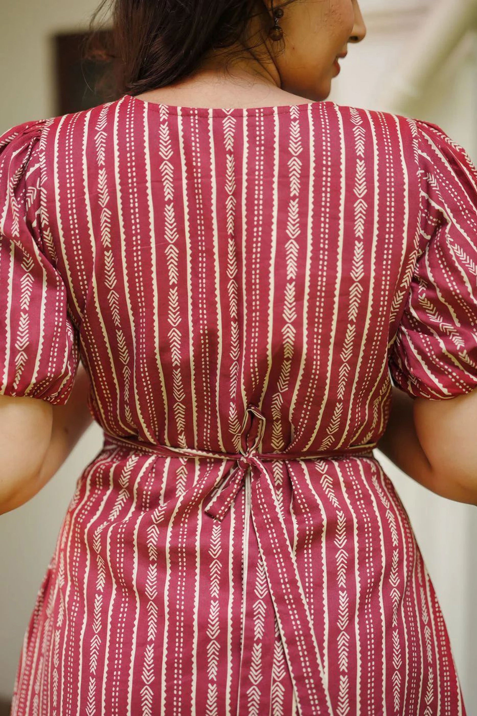 Step out in effortless elegance with this Women’s Maroon A-line Dress. Designed with a flattering V neck and stylish above-elbow puffed sleeves, this dress adds sophistication to any occasion. The straight waist features a chic tie for adjustable comfort, while the semi-flared hem ensures a graceful silhouette. Crafted from soft viscose material with a lined red and cream print, it’s perfect for staying stylish and comfortable all day long. Pair it with heels for formal gatherings or sandals for casual outings!