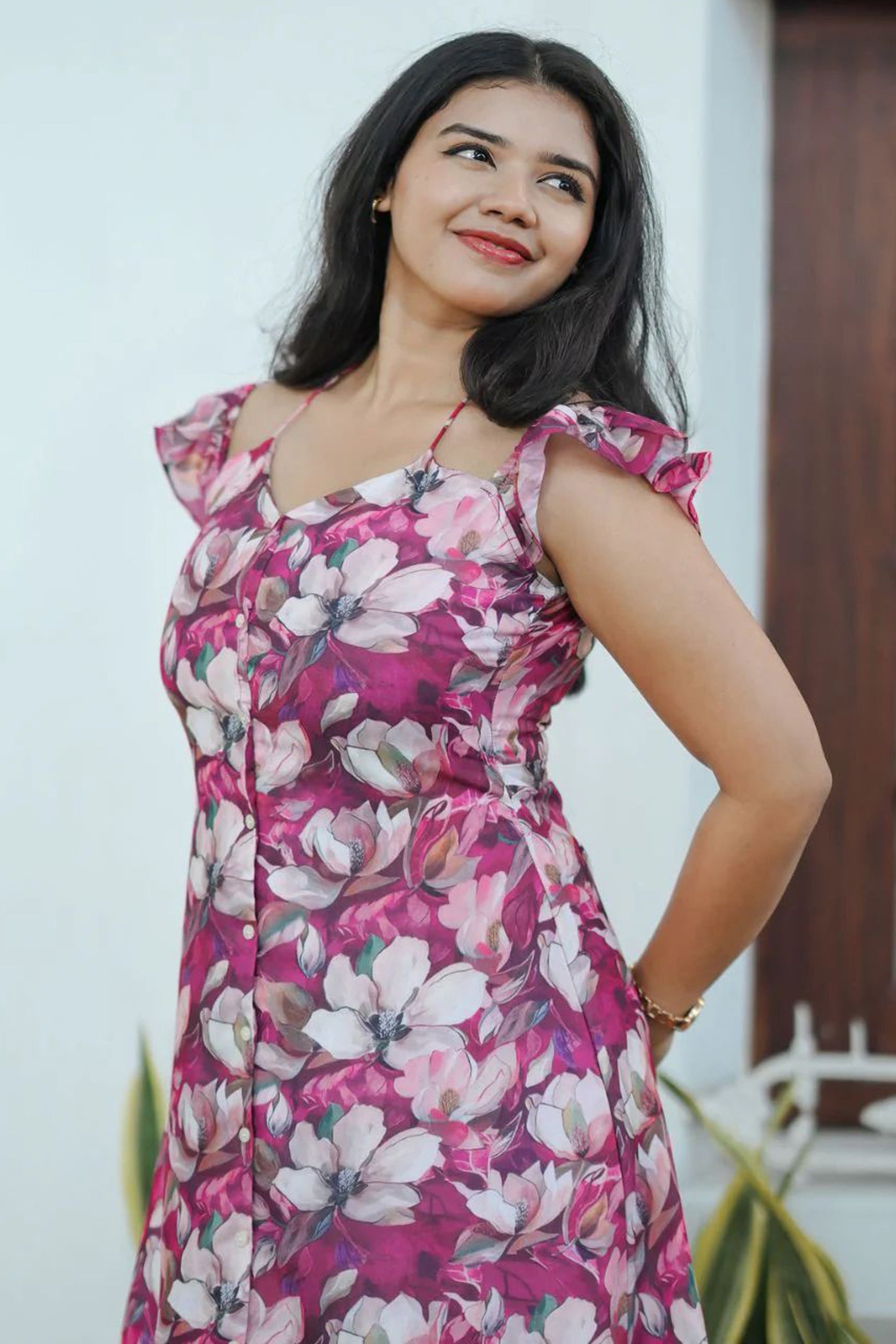 Add charm to your wardrobe with this Women’s Rosy Pink Floral Print Meadow A-line Dress. Its vibrant pink and multicolored floral design is complemented by a flattering sweetheart neckline with a tie detail and flutter sleeves for a breezy feel. The gathered and tiered hem adds movement and elegance, while the button details at the front lend a subtle, chic touch. Crafted from soft viscose with a comfortable lining, this dress offers a perfect blend of comfort and style. Whether you’re attending brunch or taking a walk in the park, this dress keeps you effortlessly stylish all day long.