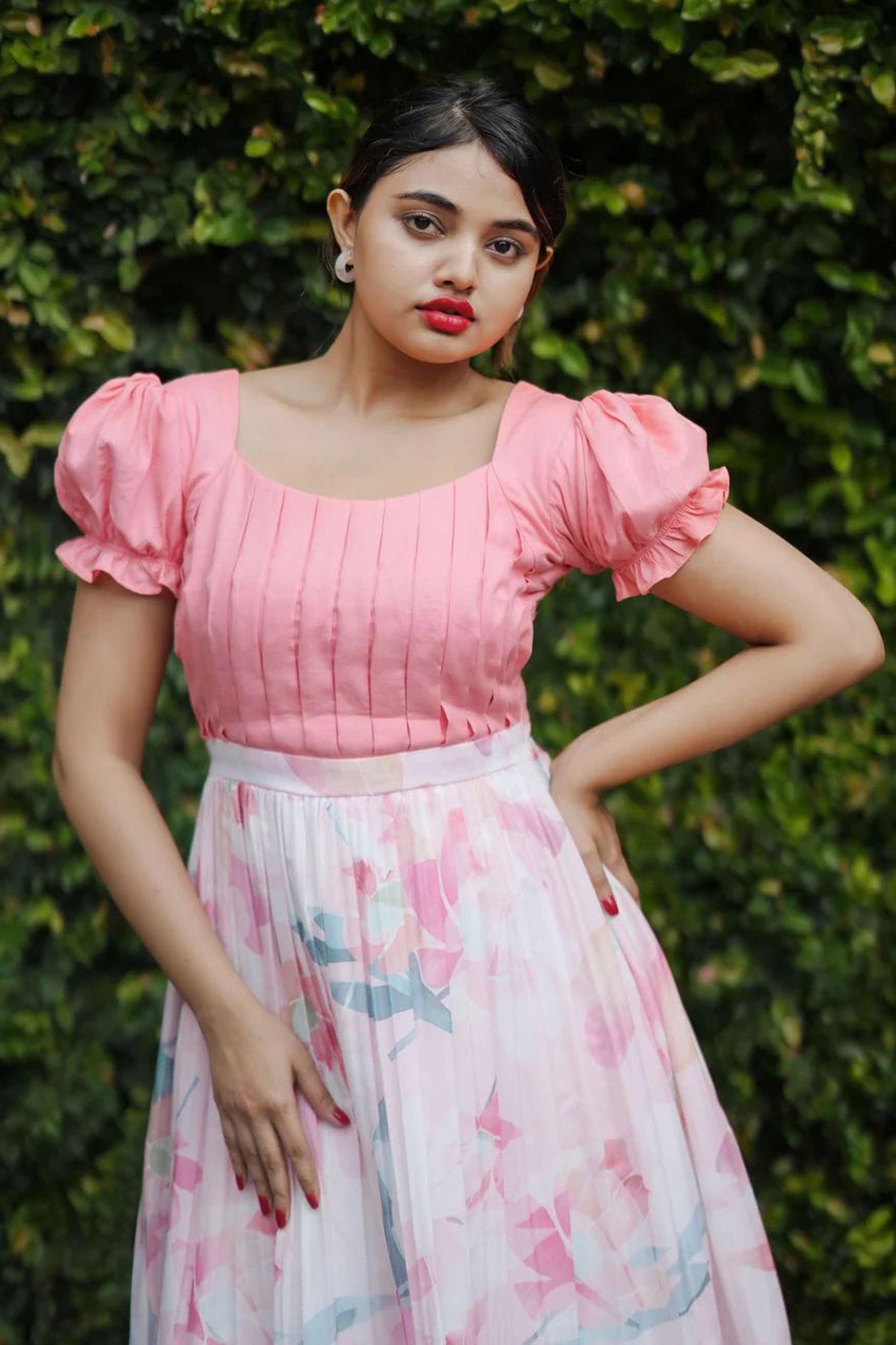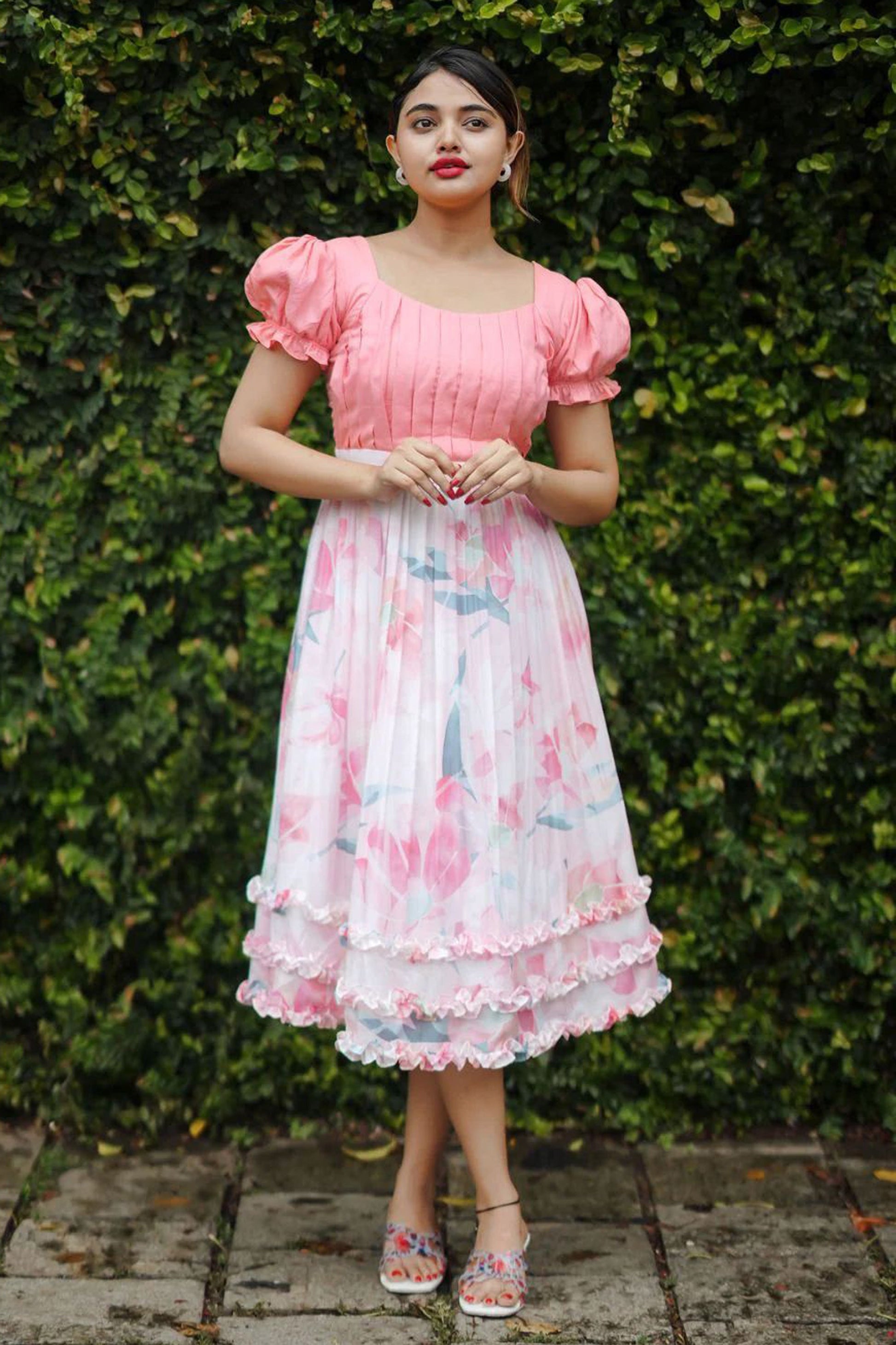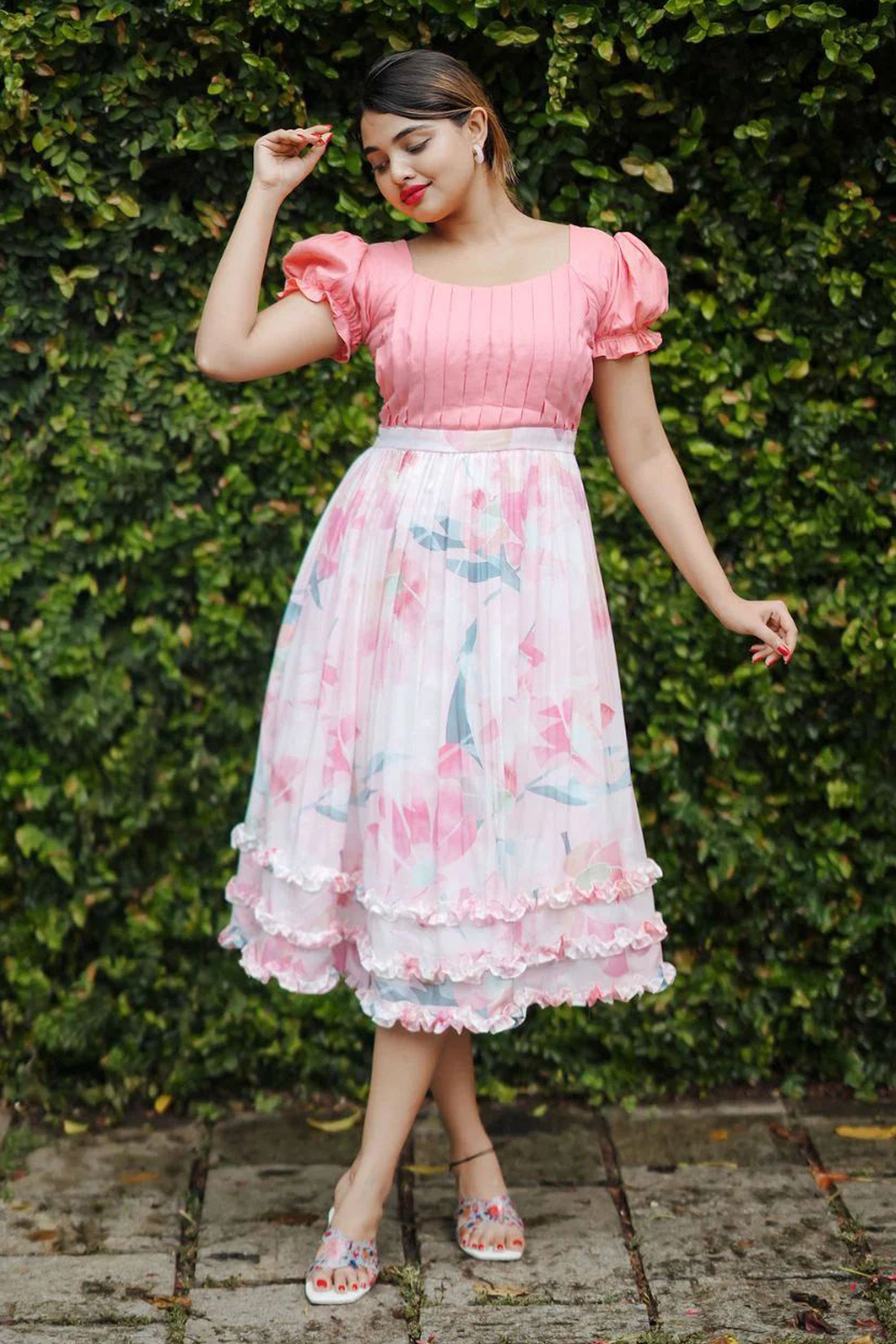 Step into effortless style with this Women's Daisy Drizzle Pink Dress. This beautiful piece showcases a dreamy combination of peach and cream with an abstract print that enhances its elegant vibe. The flowy design is crafted from soft viscose and muslin, ensuring all-day comfort and grace. Featuring a wide neck and a pleated yoke, the short puffed sleeves add charm, while the fitted waist creates a flattering silhouette. The flared hem, complete with ruffles, provides playful movement with every step. Fully lined and with a length of 46", it is perfect for casual outings or relaxed social gatherings.